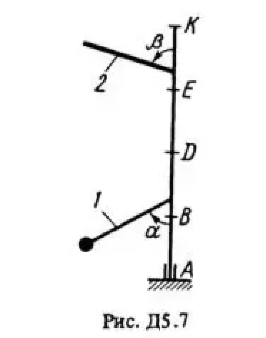 Вертикальный вал AK (рис. Д5.0-Д5.9, табл. Д5), вращающийся с постоянной угловой скоростью ω = 10 с-1, закреплен подпятником в точке А и цилиндрическим подшипником в точке, указанной в табл. Д5 в столбце 2 (AB = BD = DE = EK = b). К валу жестко прикреплены невесомый стержень 1 длиной l1 = 0,4 м с точечной массой m1 = 6 кг на конце и однородный стержень 2 длиной l2 = 0,6 м, имеющий массу m2 = 4 кг; оба стержня лежат в одной плоскости. Точки крепления стержней к валу указаны в таблице в столбцах 3 и 4, а углы α и β – в столбцах 5 и 6.