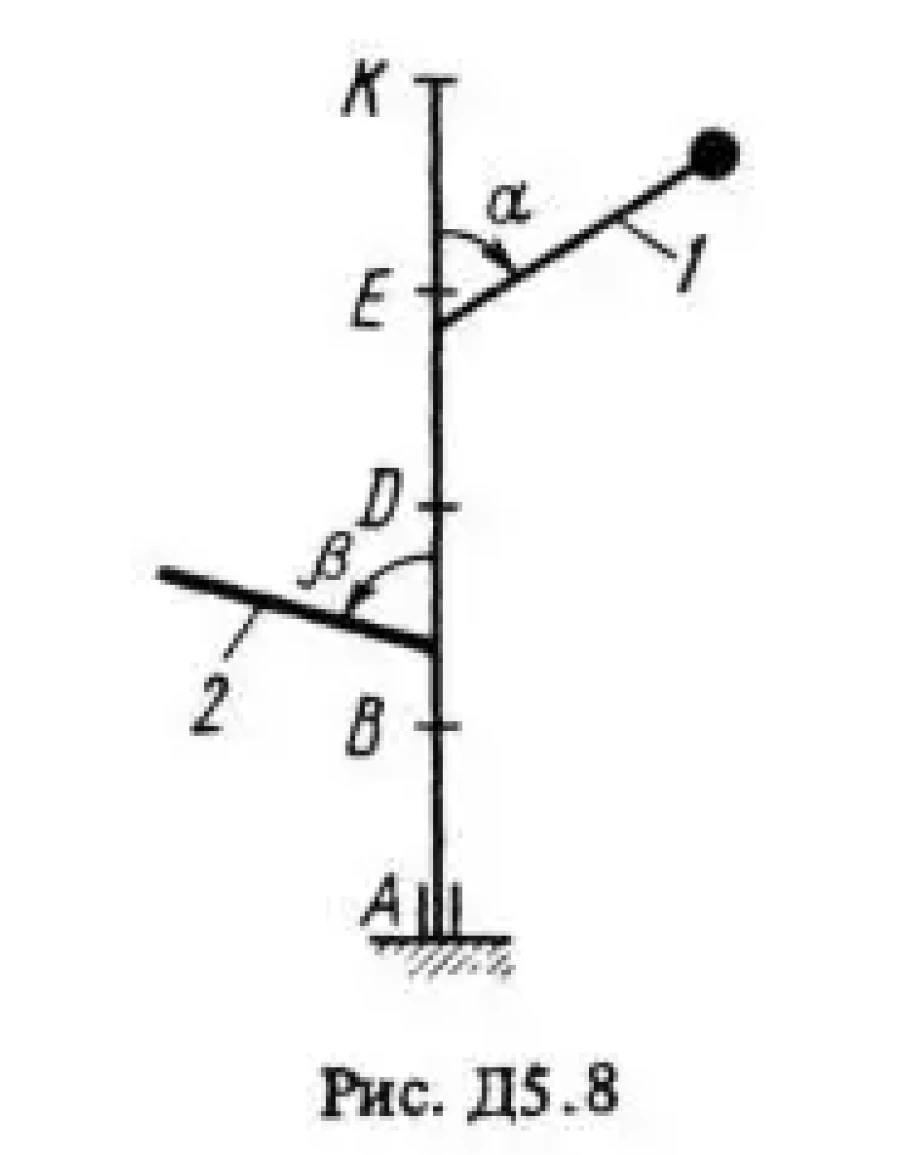 Вертикальный вал AK (рис. Д5.0-Д5.9, табл. Д5), вращающийся с постоянной угловой скоростью ω = 10 с-1, закреплен подпятником в точке А и цилиндрическим подшипником в точке, указанной в табл. Д5 в столбце 2 (AB = BD = DE = EK = b). К валу жестко прикреплены невесомый стержень 1 длиной l1 = 0,4 м с точечной массой m1 = 6 кг на конце и однородный стержень 2 длиной l2 = 0,6 м, имеющий массу m2 = 4 кг; оба стержня лежат в одной плоскости. Точки крепления стержней к валу указаны в таблице в столбцах 3 и 4, а углы α и β – в столбцах 5 и 6.