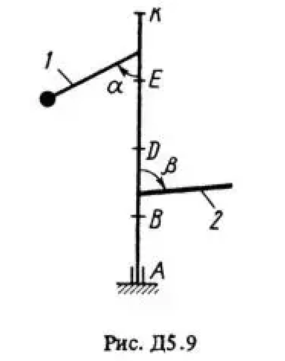 Вертикальный вал AK (рис. Д5.0-Д5.9, табл. Д5), вращающийся с постоянной угловой скоростью ω = 10 с-1, закреплен подпятником в точке А и цилиндрическим подшипником в точке, указанной в табл. Д5 в столбце 2 (AB = BD = DE = EK = b). К валу жестко прикреплены невесомый стержень 1 длиной l1 = 0,4 м с точечной массой m1 = 6 кг на конце и однородный стержень 2 длиной l2 = 0,6 м, имеющий массу m2 = 4 кг; оба стержня лежат в одной плоскости. Точки крепления стержней к валу указаны в таблице в столбцах 3 и 4, а углы α и β – в столбцах 5 и 6.