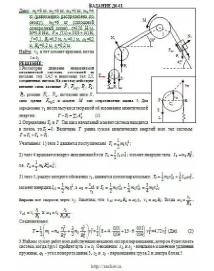 Механическая система состоит из грузов 1 и 2, ступенчатого шкива 3 с радиусами ступеней R3 = 0,3 м, r3 = 0,1 м и радиусом инерции относительно оси вращения ρ3 = 0,2 м, блока 4 радиуса R4 = 0,2 м и катка (или подвижного блока) 5 (рис. Д6.0 — Д6.9, табл. Д6); тело 5 считать сплошным однородным цилиндром, а массу блока 4 — равномерно распределенной по ободу. Коэффициент трения грузов о плоскость f = 0,1. Тела системы соединены друг с другом нитями, перекинутыми через блоки и намотанными на шкив 3 (или на шкив и каток); участки нитей параллельны соответствующим плоскостям. К одному из тел прикреплена пружина с коэффициентом жесткости c. Под действием силы F = f(s), зависящей от перемещения s точки ее приложения, система приходит в движение из состояния покоя; деформация пружины в момент начала движения равна нулю. При движении на шкив 3 действует постоянный момент М сил сопротивления (от трения в подшипниках). Определить значение искомой величины в тот момент времени, когда перемещение s станет равным s1 = 0,2 м. Искомая величина указана в столбце «Найти» таблицы, где обозначено: v1, v2, vC5 — скорости грузов 1, 2 и центра масс тела 5 соответственно, ω3 и ω4 — угловые скорости тел 3 и 4. Все катки, включая и катки, обмотанные нитями (как, например, каток 5 на рис. 2), катятся по плоскостям без скольжения. На всех рисунках не изображать груз 2, если m2 = 0; остальные тела должны изображаться и тогда, когда их масса равна нулю.