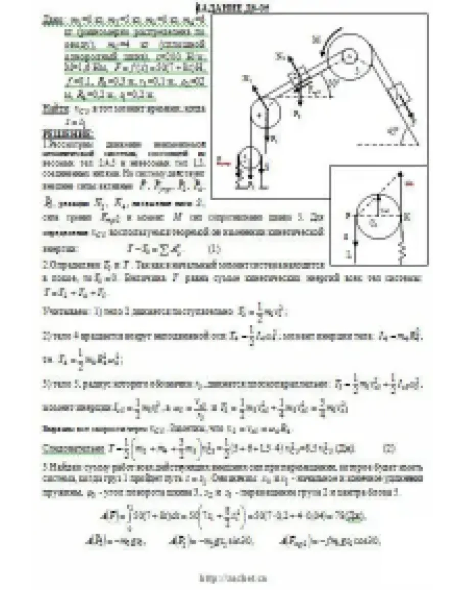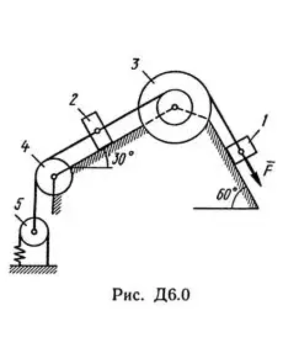 Механическая система состоит из грузов 1 и 2, ступенчатого шкива 3 с радиусами ступеней R3 = 0,3 м, r3 = 0,1 м и радиусом инерции относительно оси вращения ρ3 = 0,2 м, блока 4 радиуса R4 = 0,2 м и катка (или подвижного блока) 5 (рис. Д6.0 — Д6.9, табл. Д6); тело 5 считать сплошным однородным цилиндром, а массу блока 4 — равномерно распределенной по ободу. Коэффициент трения грузов о плоскость f = 0,1. Тела системы соединены друг с другом нитями, перекинутыми через блоки и намотанными на шкив 3 (или на шкив и каток); участки нитей параллельны соответствующим плоскостям. К одному из тел прикреплена пружина с коэффициентом жесткости c. Под действием силы F = f(s), зависящей от перемещения s точки ее приложения, система приходит в движение из состояния покоя; деформация пружины в момент начала движения равна нулю. При движении на шкив 3 действует постоянный момент М сил сопротивления (от трения в подшипниках). Определить значение искомой величины в тот момент времени, когда перемещение s станет равным s1 = 0,2 м. Искомая величина указана в столбце «Найти» таблицы, где обозначено: v1, v2, vC5 — скорости грузов 1, 2 и центра масс тела 5 соответственно, ω3 и ω4 — угловые скорости тел 3 и 4. Все катки, включая и катки, обмотанные нитями (как, например, каток 5 на рис. 2), катятся по плоскостям без скольжения. На всех рисунках не изображать груз 2, если m2 = 0; остальные тела должны изображаться и тогда, когда их масса равна нулю.