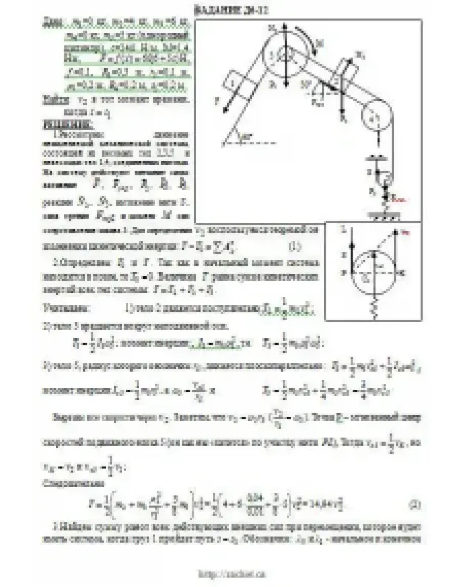 Механическая система состоит из грузов 1 и 2, ступенчатого шкива 3 с радиусами ступеней R3 = 0,3 м, r3 = 0,1 м и радиусом инерции относительно оси вращения ρ3 = 0,2 м, блока 4 радиуса R4 = 0,2 м и катка (или подвижного блока) 5 (рис. Д6.0 — Д6.9, табл. Д6); тело 5 считать сплошным однородным цилиндром, а массу блока 4 — равномерно распределенной по ободу. Коэффициент трения грузов о плоскость f = 0,1. Тела системы соединены друг с другом нитями, перекинутыми через блоки и намотанными на шкив 3 (или на шкив и каток); участки нитей параллельны соответствующим плоскостям. К одному из тел прикреплена пружина с коэффициентом жесткости c. Под действием силы F = f(s), зависящей от перемещения s точки ее приложения, система приходит в движение из состояния покоя; деформация пружины в момент начала движения равна нулю. При движении на шкив 3 действует постоянный момент М сил сопротивления (от трения в подшипниках). Определить значение искомой величины в тот момент времени, когда перемещение s станет равным s1 = 0,2 м. Искомая величина указана в столбце «Найти» таблицы, где обозначено: v1, v2, vC5 — скорости грузов 1, 2 и центра масс тела 5 соответственно, ω3 и ω4 — угловые скорости тел 3 и 4. Все катки, включая и катки, обмотанные нитями (как, например, каток 5 на рис. 2), катятся по плоскостям без скольжения. На всех рисунках не изображать груз 2, если m2 = 0; остальные тела должны изображаться и тогда, когда их масса равна нулю.