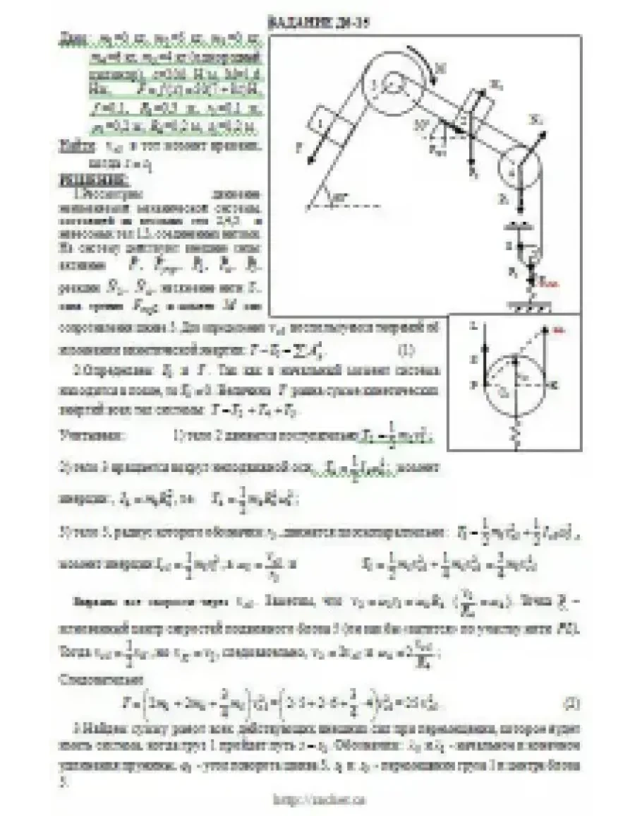 Механическая система состоит из грузов 1 и 2, ступенчатого шкива 3 с радиусами ступеней R3 = 0,3 м, r3 = 0,1 м и радиусом инерции относительно оси вращения ρ3 = 0,2 м, блока 4 радиуса R4 = 0,2 м и катка (или подвижного блока) 5 (рис. Д6.0 — Д6.9, табл. Д6); тело 5 считать сплошным однородным цилиндром, а массу блока 4 — равномерно распределенной по ободу. Коэффициент трения грузов о плоскость f = 0,1. Тела системы соединены друг с другом нитями, перекинутыми через блоки и намотанными на шкив 3 (или на шкив и каток); участки нитей параллельны соответствующим плоскостям. К одному из тел прикреплена пружина с коэффициентом жесткости c. Под действием силы F = f(s), зависящей от перемещения s точки ее приложения, система приходит в движение из состояния покоя; деформация пружины в момент начала движения равна нулю. При движении на шкив 3 действует постоянный момент М сил сопротивления (от трения в подшипниках). Определить значение искомой величины в тот момент времени, когда перемещение s станет равным s1 = 0,2 м. Искомая величина указана в столбце «Найти» таблицы, где обозначено: v1, v2, vC5 — скорости грузов 1, 2 и центра масс тела 5 соответственно, ω3 и ω4 — угловые скорости тел 3 и 4. Все катки, включая и катки, обмотанные нитями (как, например, каток 5 на рис. 2), катятся по плоскостям без скольжения. На всех рисунках не изображать груз 2, если m2 = 0; остальные тела должны изображаться и тогда, когда их масса равна нулю.