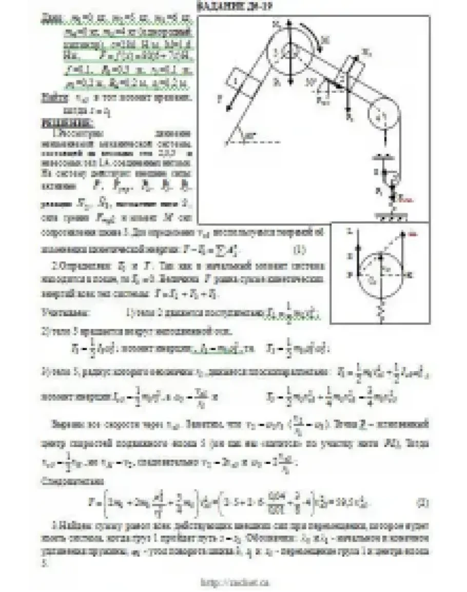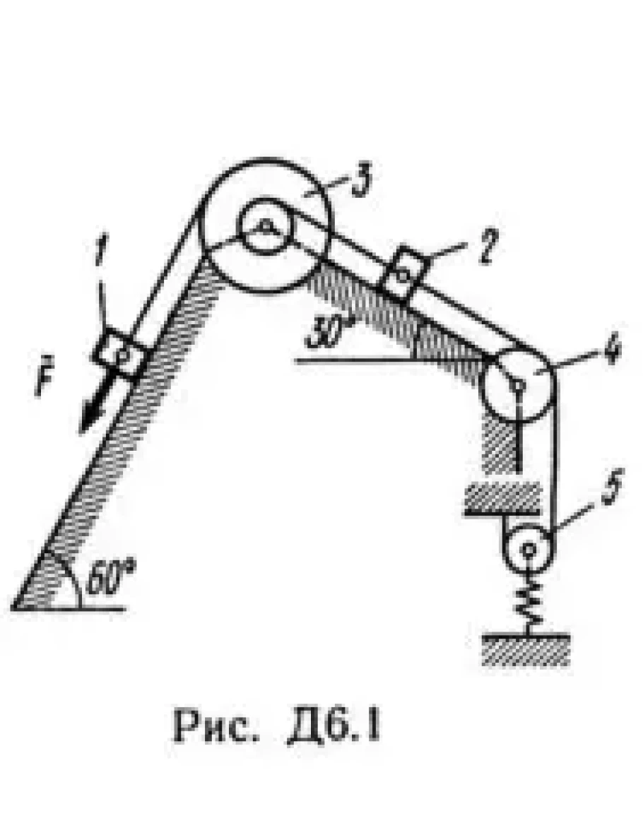 Механическая система состоит из грузов 1 и 2, ступенчатого шкива 3 с радиусами ступеней R3 = 0,3 м, r3 = 0,1 м и радиусом инерции относительно оси вращения ρ3 = 0,2 м, блока 4 радиуса R4 = 0,2 м и катка (или подвижного блока) 5 (рис. Д6.0 — Д6.9, табл. Д6); тело 5 считать сплошным однородным цилиндром, а массу блока 4 — равномерно распределенной по ободу. Коэффициент трения грузов о плоскость f = 0,1. Тела системы соединены друг с другом нитями, перекинутыми через блоки и намотанными на шкив 3 (или на шкив и каток); участки нитей параллельны соответствующим плоскостям. К одному из тел прикреплена пружина с коэффициентом жесткости c. Под действием силы F = f(s), зависящей от перемещения s точки ее приложения, система приходит в движение из состояния покоя; деформация пружины в момент начала движения равна нулю. При движении на шкив 3 действует постоянный момент М сил сопротивления (от трения в подшипниках). Определить значение искомой величины в тот момент времени, когда перемещение s станет равным s1 = 0,2 м. Искомая величина указана в столбце «Найти» таблицы, где обозначено: v1, v2, vC5 — скорости грузов 1, 2 и центра масс тела 5 соответственно, ω3 и ω4 — угловые скорости тел 3 и 4. Все катки, включая и катки, обмотанные нитями (как, например, каток 5 на рис. 2), катятся по плоскостям без скольжения. На всех рисунках не изображать груз 2, если m2 = 0; остальные тела должны изображаться и тогда, когда их масса равна нулю.