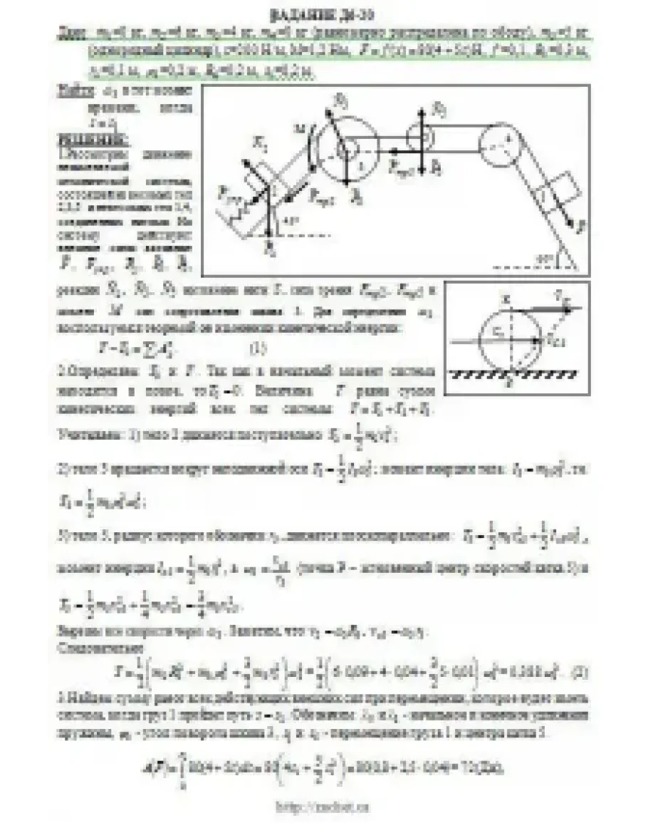 Механическая система состоит из грузов 1 и 2, ступенчатого шкива 3 с радиусами ступеней R3 = 0,3 м, r3 = 0,1 м и радиусом инерции относительно оси вращения ρ3 = 0,2 м, блока 4 радиуса R4 = 0,2 м и катка (или подвижного блока) 5 (рис. Д6.0 — Д6.9, табл. Д6); тело 5 считать сплошным однородным цилиндром, а массу блока 4 — равномерно распределенной по ободу. Коэффициент трения грузов о плоскость f = 0,1. Тела системы соединены друг с другом нитями, перекинутыми через блоки и намотанными на шкив 3 (или на шкив и каток); участки нитей параллельны соответствующим плоскостям. К одному из тел прикреплена пружина с коэффициентом жесткости c. Под действием силы F = f(s), зависящей от перемещения s точки ее приложения, система приходит в движение из состояния покоя; деформация пружины в момент начала движения равна нулю. При движении на шкив 3 действует постоянный момент М сил сопротивления (от трения в подшипниках). Определить значение искомой величины в тот момент времени, когда перемещение s станет равным s1 = 0,2 м. Искомая величина указана в столбце «Найти» таблицы, где обозначено: v1, v2, vC5 — скорости грузов 1, 2 и центра масс тела 5 соответственно, ω3 и ω4 — угловые скорости тел 3 и 4. Все катки, включая и катки, обмотанные нитями (как, например, каток 5 на рис. 2), катятся по плоскостям без скольжения. На всех рисунках не изображать груз 2, если m2 = 0; остальные тела должны изображаться и тогда, когда их масса равна нулю.