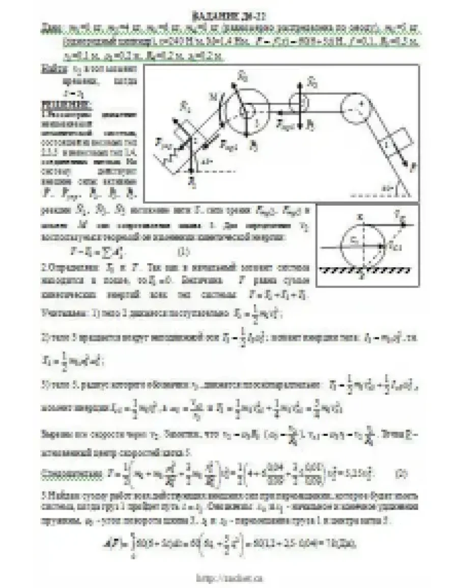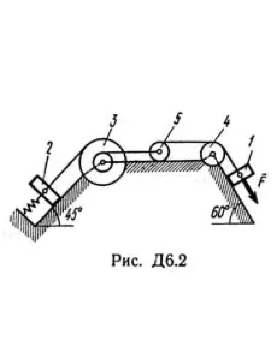 Механическая система состоит из грузов 1 и 2, ступенчатого шкива 3 с радиусами ступеней R3 = 0,3 м, r3 = 0,1 м и радиусом инерции относительно оси вращения ρ3 = 0,2 м, блока 4 радиуса R4 = 0,2 м и катка (или подвижного блока) 5 (рис. Д6.0 — Д6.9, табл. Д6); тело 5 считать сплошным однородным цилиндром, а массу блока 4 — равномерно распределенной по ободу. Коэффициент трения грузов о плоскость f = 0,1. Тела системы соединены друг с другом нитями, перекинутыми через блоки и намотанными на шкив 3 (или на шкив и каток); участки нитей параллельны соответствующим плоскостям. К одному из тел прикреплена пружина с коэффициентом жесткости c. Под действием силы F = f(s), зависящей от перемещения s точки ее приложения, система приходит в движение из состояния покоя; деформация пружины в момент начала движения равна нулю. При движении на шкив 3 действует постоянный момент М сил сопротивления (от трения в подшипниках). Определить значение искомой величины в тот момент времени, когда перемещение s станет равным s1 = 0,2 м. Искомая величина указана в столбце «Найти» таблицы, где обозначено: v1, v2, vC5 — скорости грузов 1, 2 и центра масс тела 5 соответственно, ω3 и ω4 — угловые скорости тел 3 и 4. Все катки, включая и катки, обмотанные нитями (как, например, каток 5 на рис. 2), катятся по плоскостям без скольжения. На всех рисунках не изображать груз 2, если m2 = 0; остальные тела должны изображаться и тогда, когда их масса равна нулю.