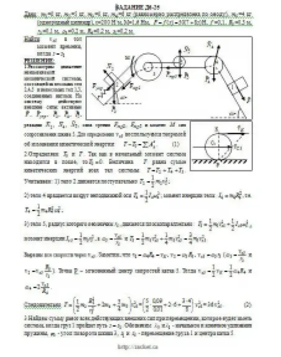 Механическая система состоит из грузов 1 и 2, ступенчатого шкива 3 с радиусами ступеней R3 = 0,3 м, r3 = 0,1 м и радиусом инерции относительно оси вращения ρ3 = 0,2 м, блока 4 радиуса R4 = 0,2 м и катка (или подвижного блока) 5 (рис. Д6.0 — Д6.9, табл. Д6); тело 5 считать сплошным однородным цилиндром, а массу блока 4 — равномерно распределенной по ободу. Коэффициент трения грузов о плоскость f = 0,1. Тела системы соединены друг с другом нитями, перекинутыми через блоки и намотанными на шкив 3 (или на шкив и каток); участки нитей параллельны соответствующим плоскостям. К одному из тел прикреплена пружина с коэффициентом жесткости c. Под действием силы F = f(s), зависящей от перемещения s точки ее приложения, система приходит в движение из состояния покоя; деформация пружины в момент начала движения равна нулю. При движении на шкив 3 действует постоянный момент М сил сопротивления (от трения в подшипниках). Определить значение искомой величины в тот момент времени, когда перемещение s станет равным s1 = 0,2 м. Искомая величина указана в столбце «Найти» таблицы, где обозначено: v1, v2, vC5 — скорости грузов 1, 2 и центра масс тела 5 соответственно, ω3 и ω4 — угловые скорости тел 3 и 4. Все катки, включая и катки, обмотанные нитями (как, например, каток 5 на рис. 2), катятся по плоскостям без скольжения. На всех рисунках не изображать груз 2, если m2 = 0; остальные тела должны изображаться и тогда, когда их масса равна нулю.