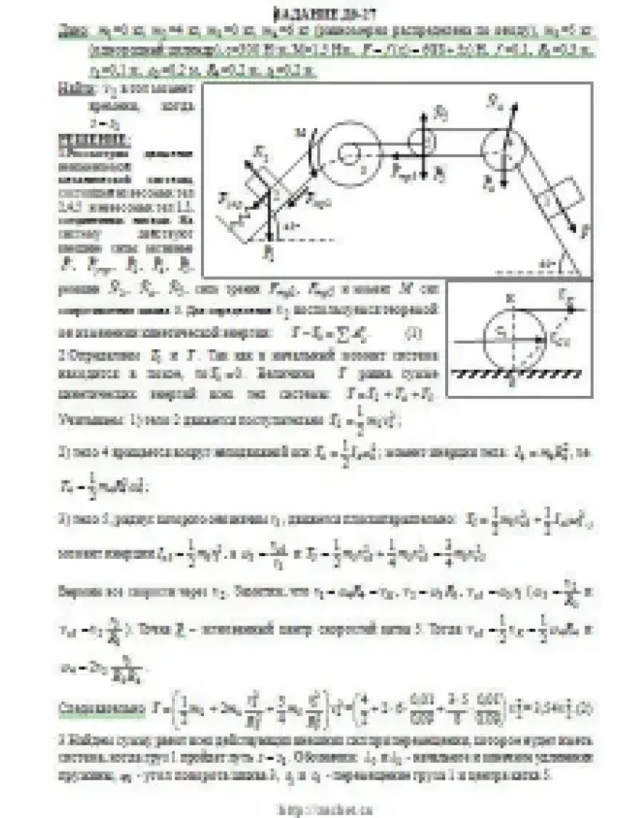 Механическая система состоит из грузов 1 и 2, ступенчатого шкива 3 с радиусами ступеней R3 = 0,3 м, r3 = 0,1 м и радиусом инерции относительно оси вращения ρ3 = 0,2 м, блока 4 радиуса R4 = 0,2 м и катка (или подвижного блока) 5 (рис. Д6.0 — Д6.9, табл. Д6); тело 5 считать сплошным однородным цилиндром, а массу блока 4 — равномерно распределенной по ободу. Коэффициент трения грузов о плоскость f = 0,1. Тела системы соединены друг с другом нитями, перекинутыми через блоки и намотанными на шкив 3 (или на шкив и каток); участки нитей параллельны соответствующим плоскостям. К одному из тел прикреплена пружина с коэффициентом жесткости c. Под действием силы F = f(s), зависящей от перемещения s точки ее приложения, система приходит в движение из состояния покоя; деформация пружины в момент начала движения равна нулю. При движении на шкив 3 действует постоянный момент М сил сопротивления (от трения в подшипниках). Определить значение искомой величины в тот момент времени, когда перемещение s станет равным s1 = 0,2 м. Искомая величина указана в столбце «Найти» таблицы, где обозначено: v1, v2, vC5 — скорости грузов 1, 2 и центра масс тела 5 соответственно, ω3 и ω4 — угловые скорости тел 3 и 4. Все катки, включая и катки, обмотанные нитями (как, например, каток 5 на рис. 2), катятся по плоскостям без скольжения. На всех рисунках не изображать груз 2, если m2 = 0; остальные тела должны изображаться и тогда, когда их масса равна нулю.