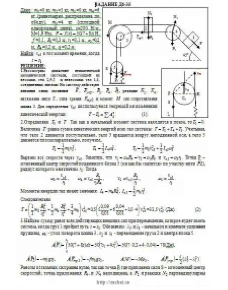 Механическая система состоит из грузов 1 и 2, ступенчатого шкива 3 с радиусами ступеней R3 = 0,3 м, r3 = 0,1 м и радиусом инерции относительно оси вращения ρ3 = 0,2 м, блока 4 радиуса R4 = 0,2 м и катка (или подвижного блока) 5 (рис. Д6.0 — Д6.9, табл. Д6); тело 5 считать сплошным однородным цилиндром, а массу блока 4 — равномерно распределенной по ободу. Коэффициент трения грузов о плоскость f = 0,1. Тела системы соединены друг с другом нитями, перекинутыми через блоки и намотанными на шкив 3 (или на шкив и каток); участки нитей параллельны соответствующим плоскостям. К одному из тел прикреплена пружина с коэффициентом жесткости c. Под действием силы F = f(s), зависящей от перемещения s точки ее приложения, система приходит в движение из состояния покоя; деформация пружины в момент начала движения равна нулю. При движении на шкив 3 действует постоянный момент М сил сопротивления (от трения в подшипниках). Определить значение искомой величины в тот момент времени, когда перемещение s станет равным s1 = 0,2 м. Искомая величина указана в столбце «Найти» таблицы, где обозначено: v1, v2, vC5 — скорости грузов 1, 2 и центра масс тела 5 соответственно, ω3 и ω4 — угловые скорости тел 3 и 4. Все катки, включая и катки, обмотанные нитями (как, например, каток 5 на рис. 2), катятся по плоскостям без скольжения. На всех рисунках не изображать груз 2, если m2 = 0; остальные тела должны изображаться и тогда, когда их масса равна нулю.
