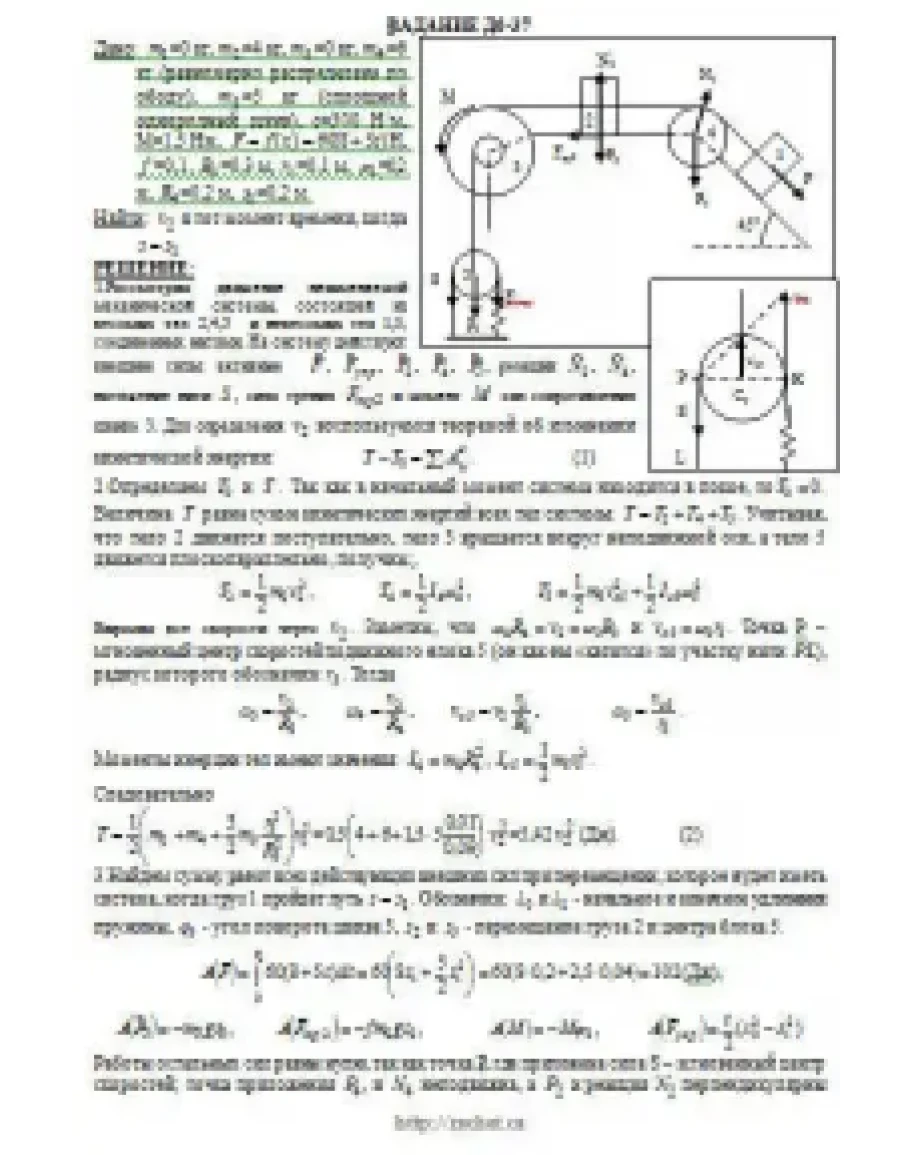 Механическая система состоит из грузов 1 и 2, ступенчатого шкива 3 с радиусами ступеней R3 = 0,3 м, r3 = 0,1 м и радиусом инерции относительно оси вращения ρ3 = 0,2 м, блока 4 радиуса R4 = 0,2 м и катка (или подвижного блока) 5 (рис. Д6.0 — Д6.9, табл. Д6); тело 5 считать сплошным однородным цилиндром, а массу блока 4 — равномерно распределенной по ободу. Коэффициент трения грузов о плоскость f = 0,1. Тела системы соединены друг с другом нитями, перекинутыми через блоки и намотанными на шкив 3 (или на шкив и каток); участки нитей параллельны соответствующим плоскостям. К одному из тел прикреплена пружина с коэффициентом жесткости c. Под действием силы F = f(s), зависящей от перемещения s точки ее приложения, система приходит в движение из состояния покоя; деформация пружины в момент начала движения равна нулю. При движении на шкив 3 действует постоянный момент М сил сопротивления (от трения в подшипниках). Определить значение искомой величины в тот момент времени, когда перемещение s станет равным s1 = 0,2 м. Искомая величина указана в столбце «Найти» таблицы, где обозначено: v1, v2, vC5 — скорости грузов 1, 2 и центра масс тела 5 соответственно, ω3 и ω4 — угловые скорости тел 3 и 4. Все катки, включая и катки, обмотанные нитями (как, например, каток 5 на рис. 2), катятся по плоскостям без скольжения. На всех рисунках не изображать груз 2, если m2 = 0; остальные тела должны изображаться и тогда, когда их масса равна нулю.