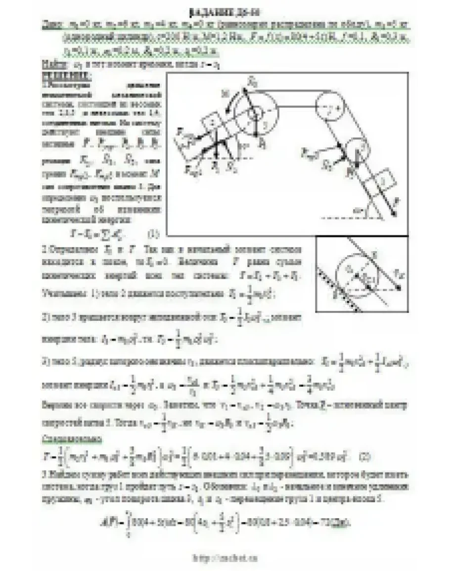 Механическая система состоит из грузов 1 и 2, ступенчатого шкива 3 с радиусами ступеней R3 = 0,3 м, r3 = 0,1 м и радиусом инерции относительно оси вращения ρ3 = 0,2 м, блока 4 радиуса R4 = 0,2 м и катка (или подвижного блока) 5 (рис. Д6.0 — Д6.9, табл. Д6); тело 5 считать сплошным однородным цилиндром, а массу блока 4 — равномерно распределенной по ободу. Коэффициент трения грузов о плоскость f = 0,1. Тела системы соединены друг с другом нитями, перекинутыми через блоки и намотанными на шкив 3 (или на шкив и каток); участки нитей параллельны соответствующим плоскостям. К одному из тел прикреплена пружина с коэффициентом жесткости c. Под действием силы F = f(s), зависящей от перемещения s точки ее приложения, система приходит в движение из состояния покоя; деформация пружины в момент начала движения равна нулю. При движении на шкив 3 действует постоянный момент М сил сопротивления (от трения в подшипниках). Определить значение искомой величины в тот момент времени, когда перемещение s станет равным s1 = 0,2 м. Искомая величина указана в столбце «Найти» таблицы, где обозначено: v1, v2, vC5 — скорости грузов 1, 2 и центра масс тела 5 соответственно, ω3 и ω4 — угловые скорости тел 3 и 4. Все катки, включая и катки, обмотанные нитями (как, например, каток 5 на рис. 2), катятся по плоскостям без скольжения. На всех рисунках не изображать груз 2, если m2 = 0; остальные тела должны изображаться и тогда, когда их масса равна нулю.