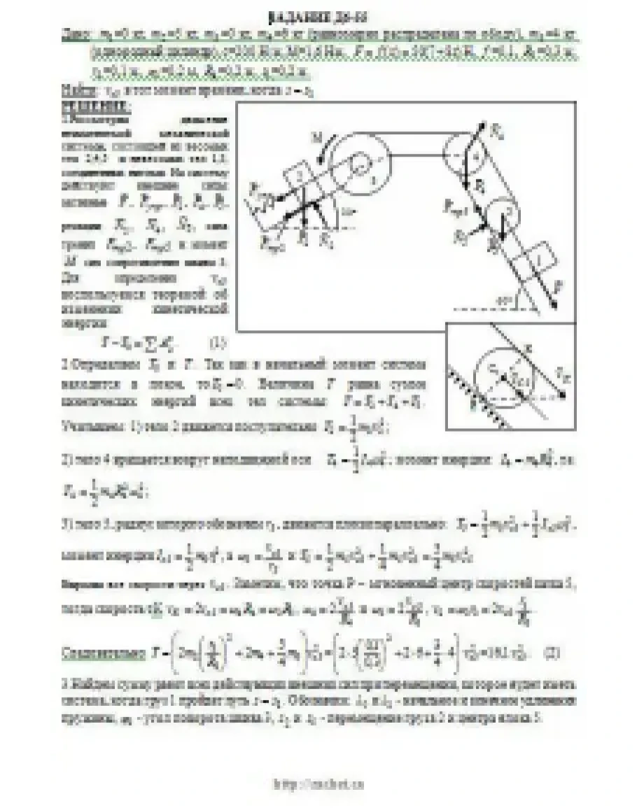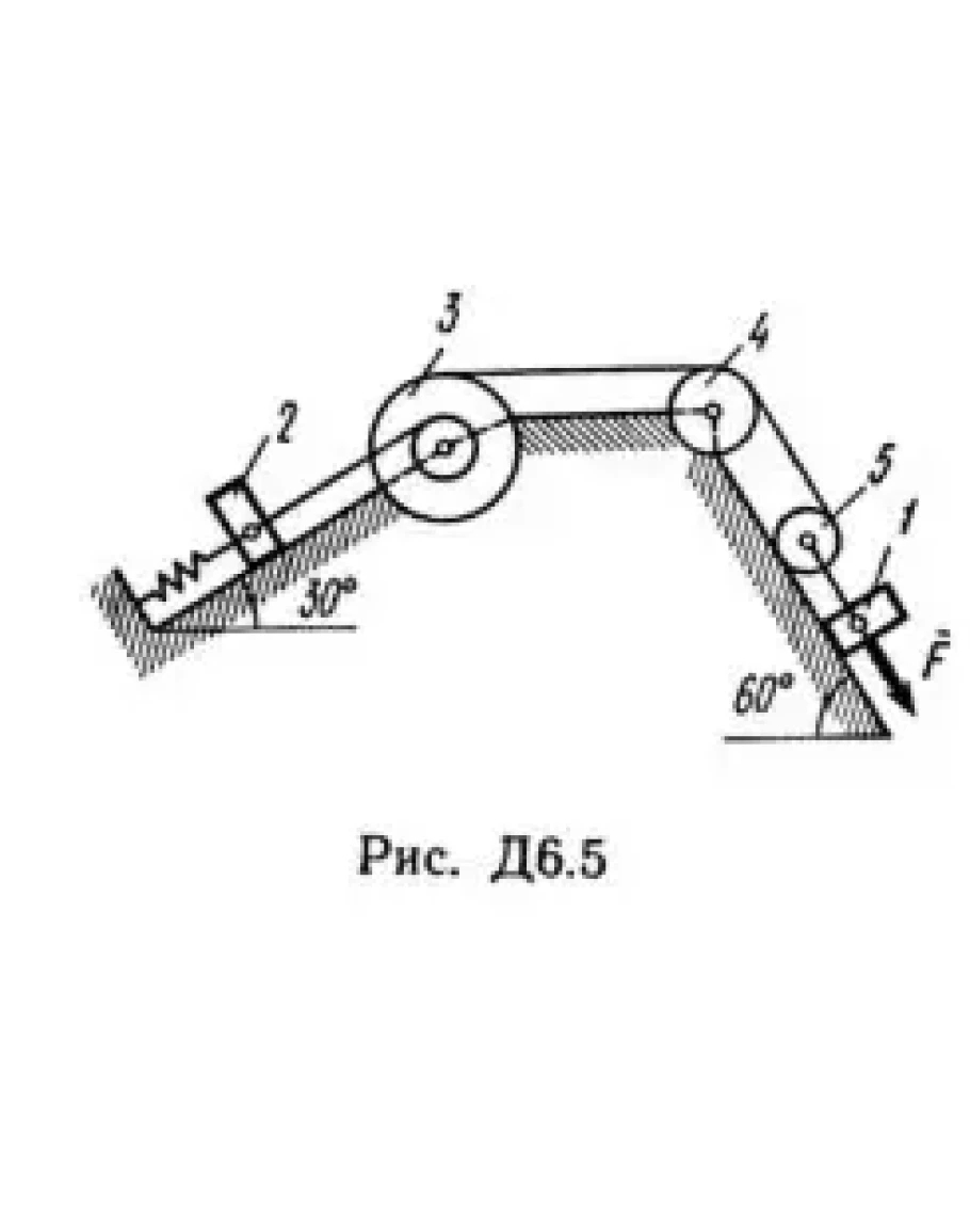 Механическая система состоит из грузов 1 и 2, ступенчатого шкива 3 с радиусами ступеней R3 = 0,3 м, r3 = 0,1 м и радиусом инерции относительно оси вращения ρ3 = 0,2 м, блока 4 радиуса R4 = 0,2 м и катка (или подвижного блока) 5 (рис. Д6.0 — Д6.9, табл. Д6); тело 5 считать сплошным однородным цилиндром, а массу блока 4 — равномерно распределенной по ободу. Коэффициент трения грузов о плоскость f = 0,1. Тела системы соединены друг с другом нитями, перекинутыми через блоки и намотанными на шкив 3 (или на шкив и каток); участки нитей параллельны соответствующим плоскостям. К одному из тел прикреплена пружина с коэффициентом жесткости c. Под действием силы F = f(s), зависящей от перемещения s точки ее приложения, система приходит в движение из состояния покоя; деформация пружины в момент начала движения равна нулю. При движении на шкив 3 действует постоянный момент М сил сопротивления (от трения в подшипниках). Определить значение искомой величины в тот момент времени, когда перемещение s станет равным s1 = 0,2 м. Искомая величина указана в столбце «Найти» таблицы, где обозначено: v1, v2, vC5 — скорости грузов 1, 2 и центра масс тела 5 соответственно, ω3 и ω4 — угловые скорости тел 3 и 4. Все катки, включая и катки, обмотанные нитями (как, например, каток 5 на рис. 2), катятся по плоскостям без скольжения. На всех рисунках не изображать груз 2, если m2 = 0; остальные тела должны изображаться и тогда, когда их масса равна нулю.
