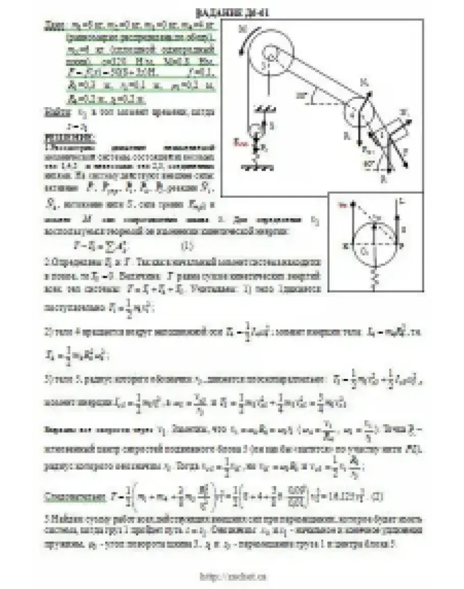 Механическая система состоит из грузов 1 и 2, ступенчатого шкива 3 с радиусами ступеней R3 = 0,3 м, r3 = 0,1 м и радиусом инерции относительно оси вращения ρ3 = 0,2 м, блока 4 радиуса R4 = 0,2 м и катка (или подвижного блока) 5 (рис. Д6.0 — Д6.9, табл. Д6); тело 5 считать сплошным однородным цилиндром, а массу блока 4 — равномерно распределенной по ободу. Коэффициент трения грузов о плоскость f = 0,1. Тела системы соединены друг с другом нитями, перекинутыми через блоки и намотанными на шкив 3 (или на шкив и каток); участки нитей параллельны соответствующим плоскостям. К одному из тел прикреплена пружина с коэффициентом жесткости c. Под действием силы F = f(s), зависящей от перемещения s точки ее приложения, система приходит в движение из состояния покоя; деформация пружины в момент начала движения равна нулю. При движении на шкив 3 действует постоянный момент М сил сопротивления (от трения в подшипниках). Определить значение искомой величины в тот момент времени, когда перемещение s станет равным s1 = 0,2 м. Искомая величина указана в столбце «Найти» таблицы, где обозначено: v1, v2, vC5 — скорости грузов 1, 2 и центра масс тела 5 соответственно, ω3 и ω4 — угловые скорости тел 3 и 4. Все катки, включая и катки, обмотанные нитями (как, например, каток 5 на рис. 2), катятся по плоскостям без скольжения. На всех рисунках не изображать груз 2, если m2 = 0; остальные тела должны изображаться и тогда, когда их масса равна нулю.