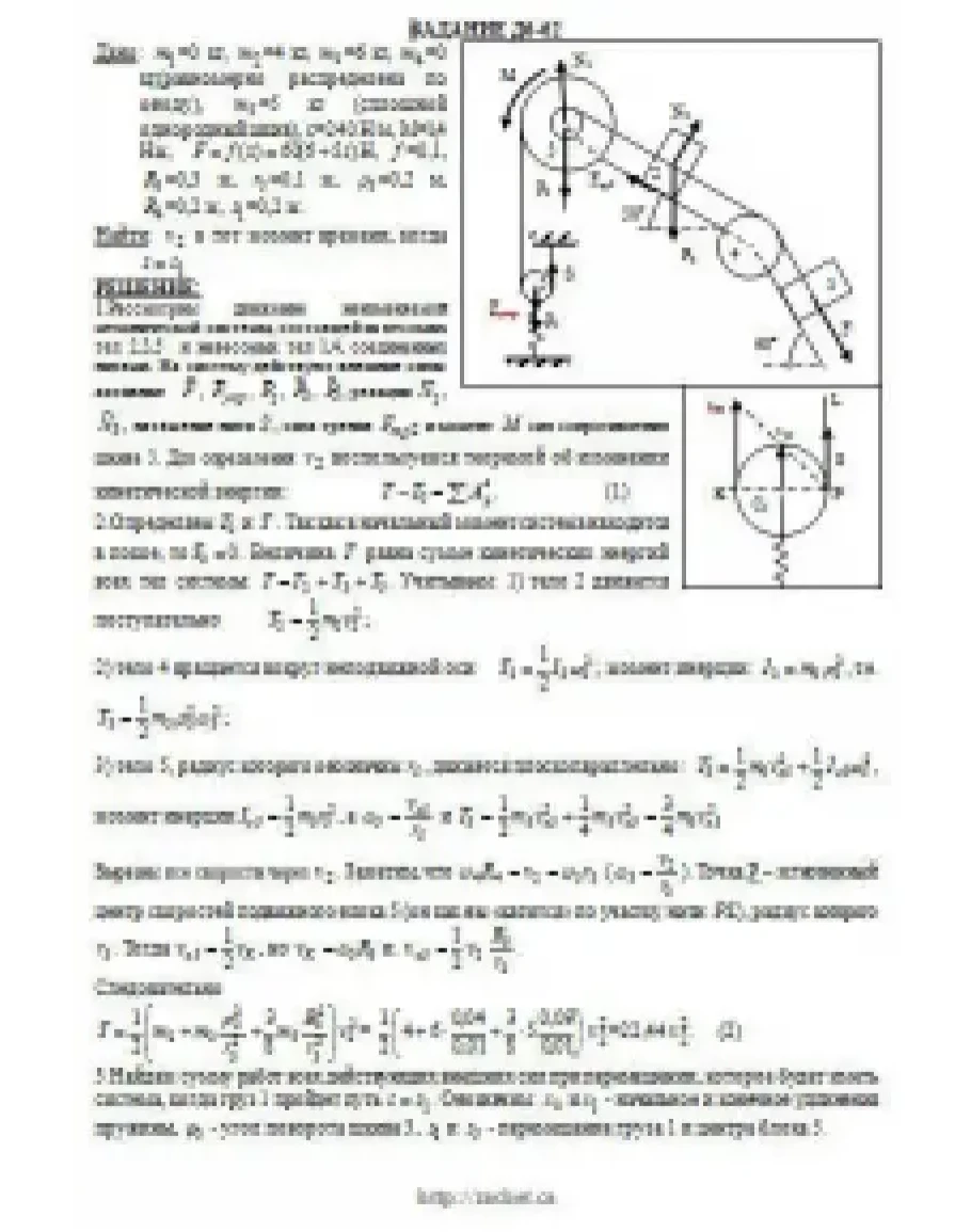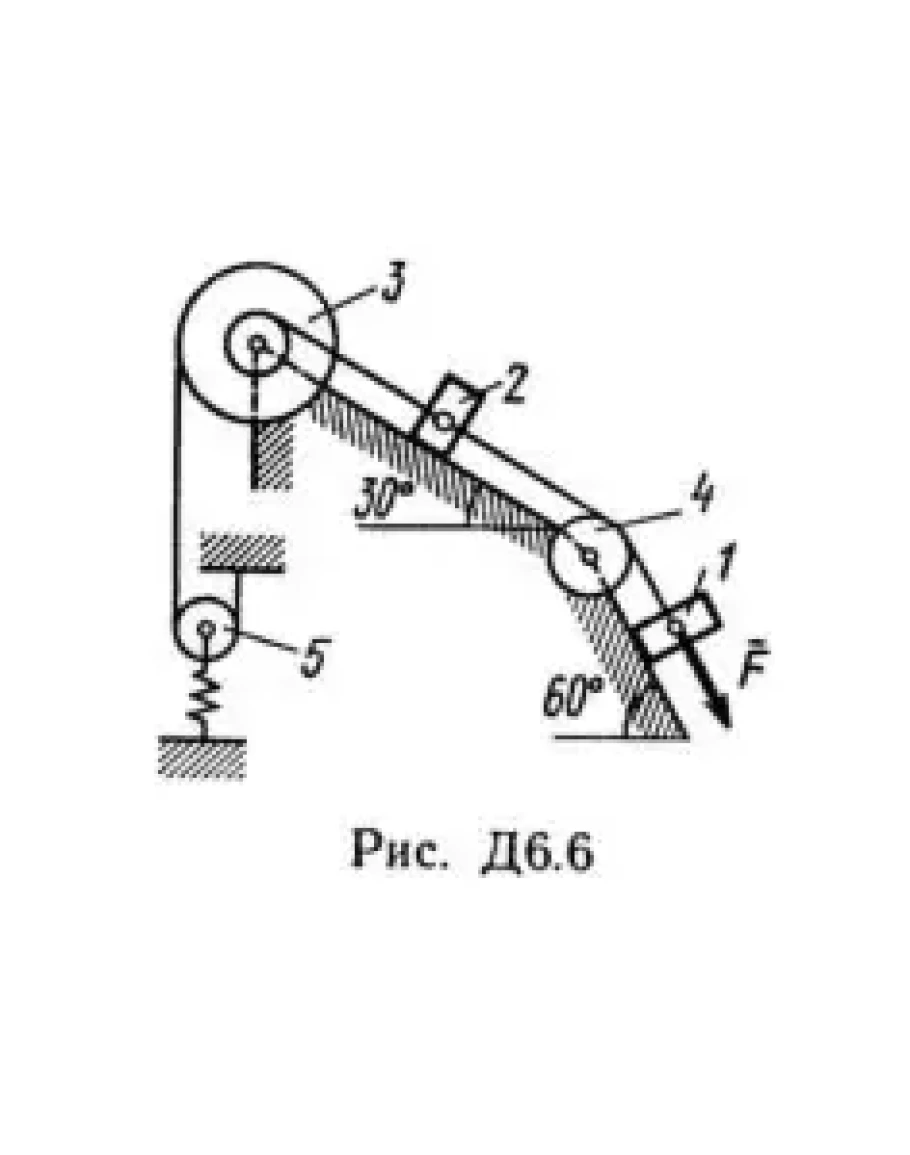 Механическая система состоит из грузов 1 и 2, ступенчатого шкива 3 с радиусами ступеней R3 = 0,3 м, r3 = 0,1 м и радиусом инерции относительно оси вращения ρ3 = 0,2 м, блока 4 радиуса R4 = 0,2 м и катка (или подвижного блока) 5 (рис. Д6.0 — Д6.9, табл. Д6); тело 5 считать сплошным однородным цилиндром, а массу блока 4 — равномерно распределенной по ободу. Коэффициент трения грузов о плоскость f = 0,1. Тела системы соединены друг с другом нитями, перекинутыми через блоки и намотанными на шкив 3 (или на шкив и каток); участки нитей параллельны соответствующим плоскостям. К одному из тел прикреплена пружина с коэффициентом жесткости c. Под действием силы F = f(s), зависящей от перемещения s точки ее приложения, система приходит в движение из состояния покоя; деформация пружины в момент начала движения равна нулю. При движении на шкив 3 действует постоянный момент М сил сопротивления (от трения в подшипниках). Определить значение искомой величины в тот момент времени, когда перемещение s станет равным s1 = 0,2 м. Искомая величина указана в столбце «Найти» таблицы, где обозначено: v1, v2, vC5 — скорости грузов 1, 2 и центра масс тела 5 соответственно, ω3 и ω4 — угловые скорости тел 3 и 4. Все катки, включая и катки, обмотанные нитями (как, например, каток 5 на рис. 2), катятся по плоскостям без скольжения. На всех рисунках не изображать груз 2, если m2 = 0; остальные тела должны изображаться и тогда, когда их масса равна нулю.