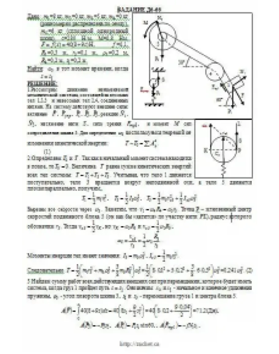Механическая система состоит из грузов 1 и 2, ступенчатого шкива 3 с радиусами ступеней R3 = 0,3 м, r3 = 0,1 м и радиусом инерции относительно оси вращения ρ3 = 0,2 м, блока 4 радиуса R4 = 0,2 м и катка (или подвижного блока) 5 (рис. Д6.0 — Д6.9, табл. Д6); тело 5 считать сплошным однородным цилиндром, а массу блока 4 — равномерно распределенной по ободу. Коэффициент трения грузов о плоскость f = 0,1. Тела системы соединены друг с другом нитями, перекинутыми через блоки и намотанными на шкив 3 (или на шкив и каток); участки нитей параллельны соответствующим плоскостям. К одному из тел прикреплена пружина с коэффициентом жесткости c. Под действием силы F = f(s), зависящей от перемещения s точки ее приложения, система приходит в движение из состояния покоя; деформация пружины в момент начала движения равна нулю. При движении на шкив 3 действует постоянный момент М сил сопротивления (от трения в подшипниках). Определить значение искомой величины в тот момент времени, когда перемещение s станет равным s1 = 0,2 м. Искомая величина указана в столбце «Найти» таблицы, где обозначено: v1, v2, vC5 — скорости грузов 1, 2 и центра масс тела 5 соответственно, ω3 и ω4 — угловые скорости тел 3 и 4. Все катки, включая и катки, обмотанные нитями (как, например, каток 5 на рис. 2), катятся по плоскостям без скольжения. На всех рисунках не изображать груз 2, если m2 = 0; остальные тела должны изображаться и тогда, когда их масса равна нулю.