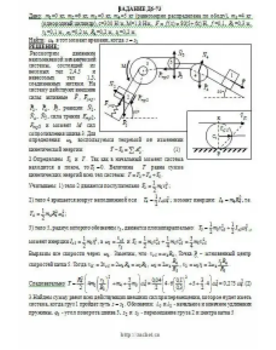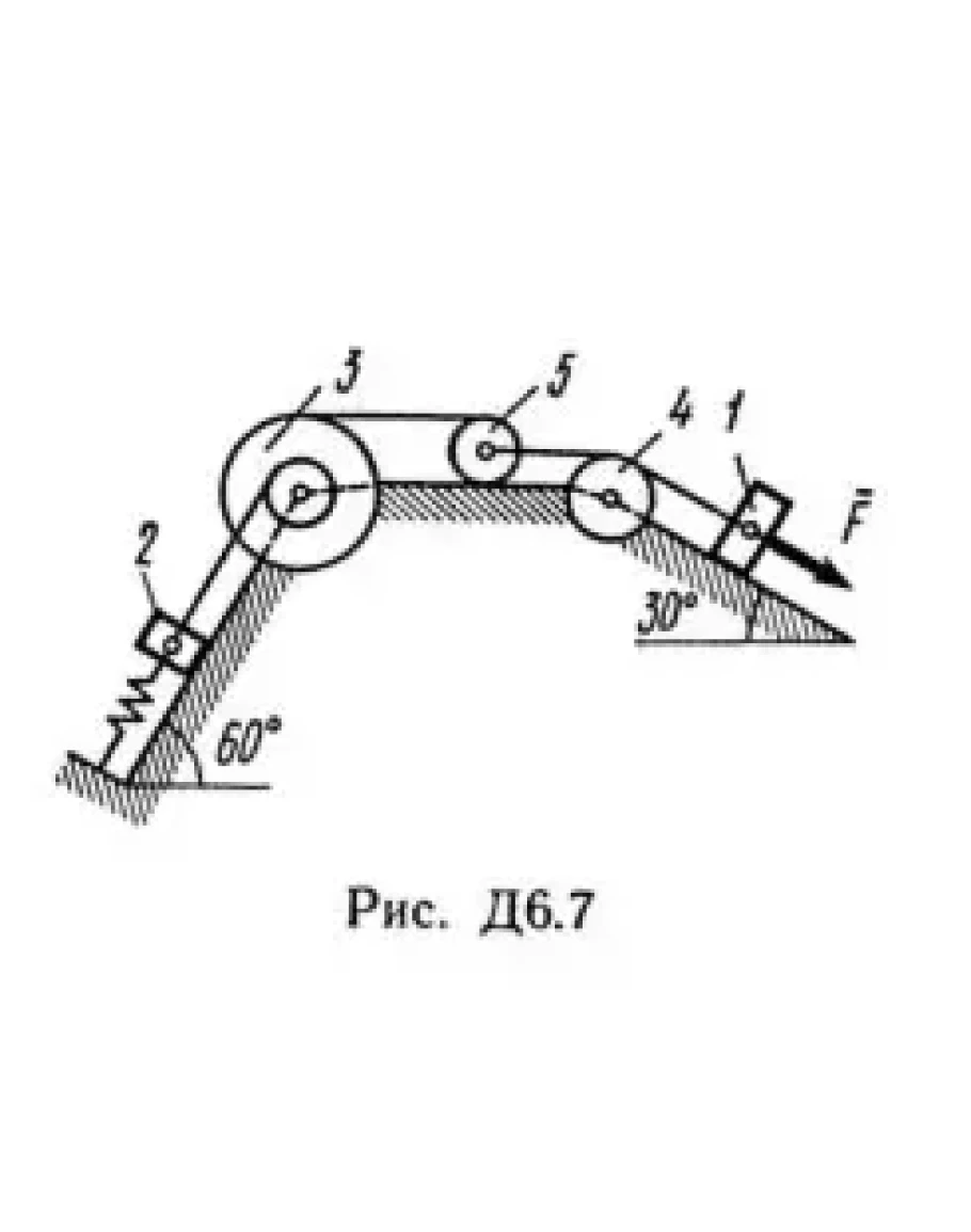 Механическая система состоит из грузов 1 и 2, ступенчатого шкива 3 с радиусами ступеней R3 = 0,3 м, r3 = 0,1 м и радиусом инерции относительно оси вращения ρ3 = 0,2 м, блока 4 радиуса R4 = 0,2 м и катка (или подвижного блока) 5 (рис. Д6.0 — Д6.9, табл. Д6); тело 5 считать сплошным однородным цилиндром, а массу блока 4 — равномерно распределенной по ободу. Коэффициент трения грузов о плоскость f = 0,1. Тела системы соединены друг с другом нитями, перекинутыми через блоки и намотанными на шкив 3 (или на шкив и каток); участки нитей параллельны соответствующим плоскостям. К одному из тел прикреплена пружина с коэффициентом жесткости c. Под действием силы F = f(s), зависящей от перемещения s точки ее приложения, система приходит в движение из состояния покоя; деформация пружины в момент начала движения равна нулю. При движении на шкив 3 действует постоянный момент М сил сопротивления (от трения в подшипниках). Определить значение искомой величины в тот момент времени, когда перемещение s станет равным s1 = 0,2 м. Искомая величина указана в столбце «Найти» таблицы, где обозначено: v1, v2, vC5 — скорости грузов 1, 2 и центра масс тела 5 соответственно, ω3 и ω4 — угловые скорости тел 3 и 4. Все катки, включая и катки, обмотанные нитями (как, например, каток 5 на рис. 2), катятся по плоскостям без скольжения. На всех рисунках не изображать груз 2, если m2 = 0; остальные тела должны изображаться и тогда, когда их масса равна нулю.