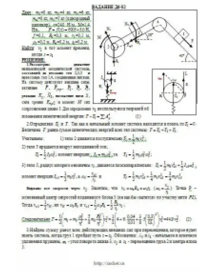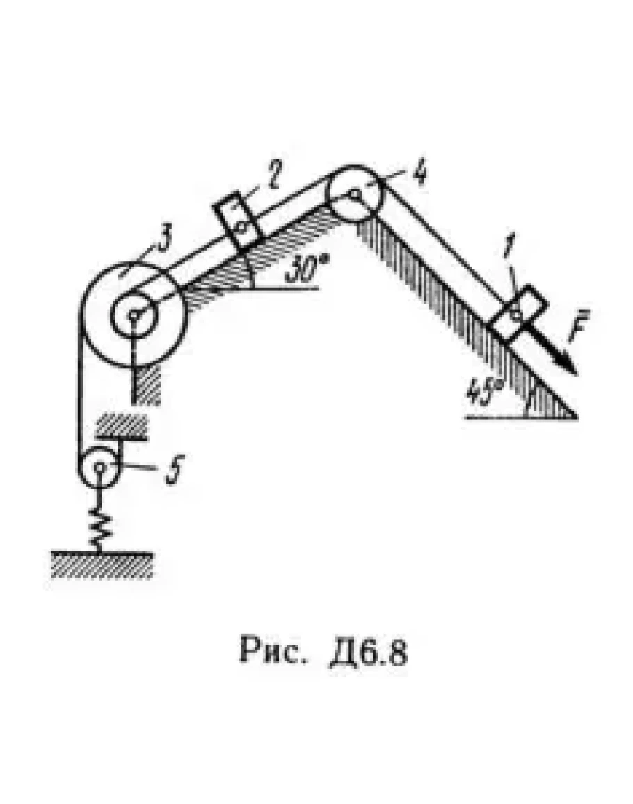 Механическая система состоит из грузов 1 и 2, ступенчатого шкива 3 с радиусами ступеней R3 = 0,3 м, r3 = 0,1 м и радиусом инерции относительно оси вращения ρ3 = 0,2 м, блока 4 радиуса R4 = 0,2 м и катка (или подвижного блока) 5 (рис. Д6.0 — Д6.9, табл. Д6); тело 5 считать сплошным однородным цилиндром, а массу блока 4 — равномерно распределенной по ободу. Коэффициент трения грузов о плоскость f = 0,1. Тела системы соединены друг с другом нитями, перекинутыми через блоки и намотанными на шкив 3 (или на шкив и каток); участки нитей параллельны соответствующим плоскостям. К одному из тел прикреплена пружина с коэффициентом жесткости c. Под действием силы F = f(s), зависящей от перемещения s точки ее приложения, система приходит в движение из состояния покоя; деформация пружины в момент начала движения равна нулю. При движении на шкив 3 действует постоянный момент М сил сопротивления (от трения в подшипниках). Определить значение искомой величины в тот момент времени, когда перемещение s станет равным s1 = 0,2 м. Искомая величина указана в столбце «Найти» таблицы, где обозначено: v1, v2, vC5 — скорости грузов 1, 2 и центра масс тела 5 соответственно, ω3 и ω4 — угловые скорости тел 3 и 4. Все катки, включая и катки, обмотанные нитями (как, например, каток 5 на рис. 2), катятся по плоскостям без скольжения. На всех рисунках не изображать груз 2, если m2 = 0; остальные тела должны изображаться и тогда, когда их масса равна нулю.
