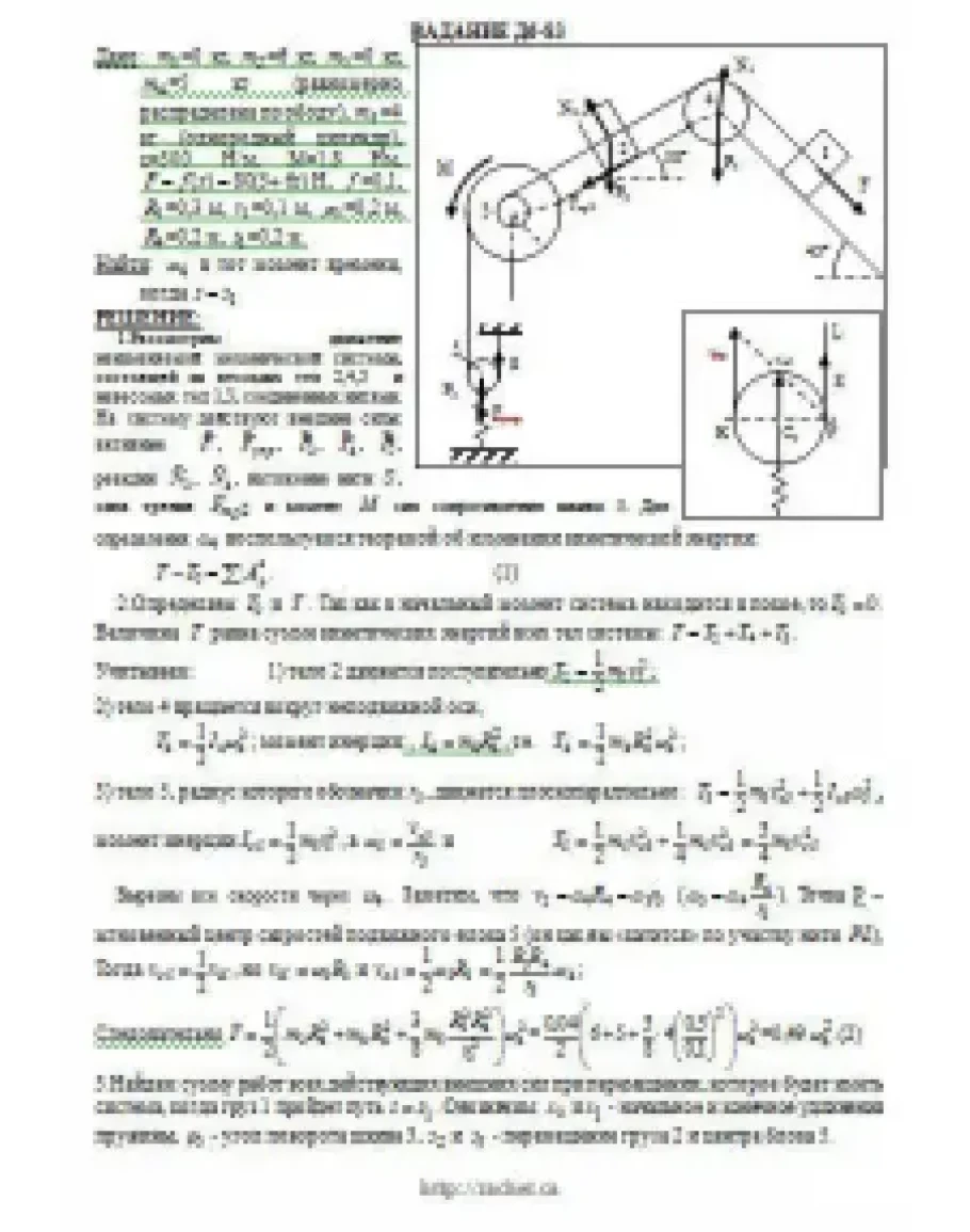 Механическая система состоит из грузов 1 и 2, ступенчатого шкива 3 с радиусами ступеней R3 = 0,3 м, r3 = 0,1 м и радиусом инерции относительно оси вращения ρ3 = 0,2 м, блока 4 радиуса R4 = 0,2 м и катка (или подвижного блока) 5 (рис. Д6.0 — Д6.9, табл. Д6); тело 5 считать сплошным однородным цилиндром, а массу блока 4 — равномерно распределенной по ободу. Коэффициент трения грузов о плоскость f = 0,1. Тела системы соединены друг с другом нитями, перекинутыми через блоки и намотанными на шкив 3 (или на шкив и каток); участки нитей параллельны соответствующим плоскостям. К одному из тел прикреплена пружина с коэффициентом жесткости c. Под действием силы F = f(s), зависящей от перемещения s точки ее приложения, система приходит в движение из состояния покоя; деформация пружины в момент начала движения равна нулю. При движении на шкив 3 действует постоянный момент М сил сопротивления (от трения в подшипниках). Определить значение искомой величины в тот момент времени, когда перемещение s станет равным s1 = 0,2 м. Искомая величина указана в столбце «Найти» таблицы, где обозначено: v1, v2, vC5 — скорости грузов 1, 2 и центра масс тела 5 соответственно, ω3 и ω4 — угловые скорости тел 3 и 4. Все катки, включая и катки, обмотанные нитями (как, например, каток 5 на рис. 2), катятся по плоскостям без скольжения. На всех рисунках не изображать груз 2, если m2 = 0; остальные тела должны изображаться и тогда, когда их масса равна нулю.