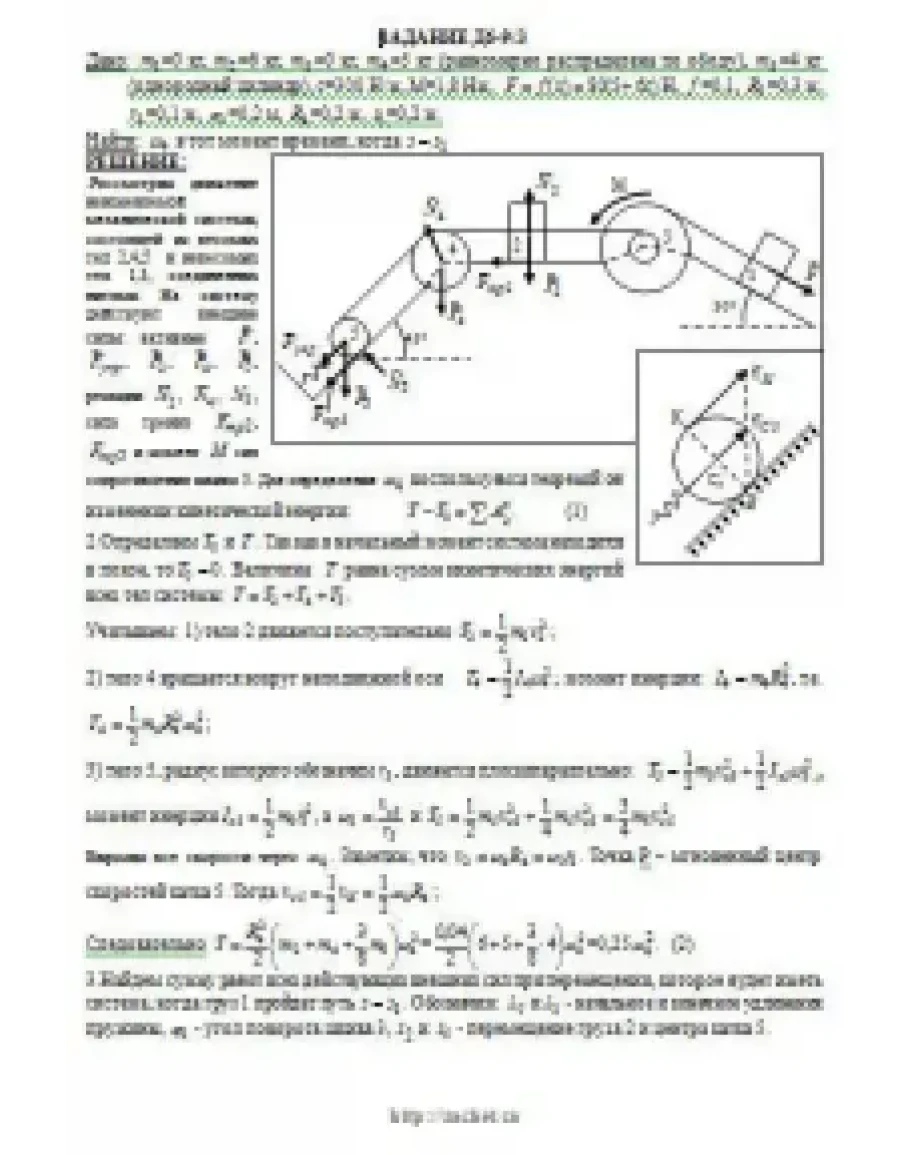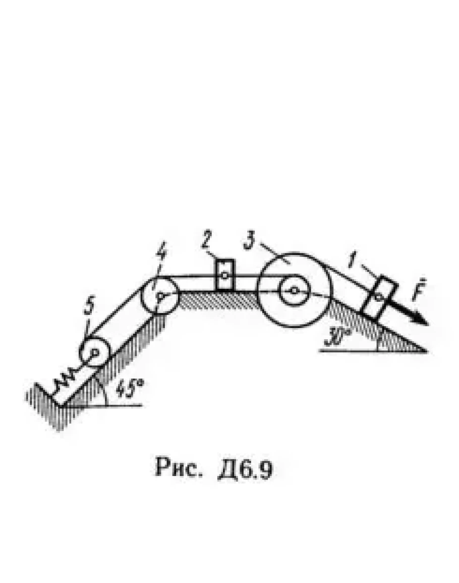 Механическая система состоит из грузов 1 и 2, ступенчатого шкива 3 с радиусами ступеней R3 = 0,3 м, r3 = 0,1 м и радиусом инерции относительно оси вращения ρ3 = 0,2 м, блока 4 радиуса R4 = 0,2 м и катка (или подвижного блока) 5 (рис. Д6.0 — Д6.9, табл. Д6); тело 5 считать сплошным однородным цилиндром, а массу блока 4 — равномерно распределенной по ободу. Коэффициент трения грузов о плоскость f = 0,1. Тела системы соединены друг с другом нитями, перекинутыми через блоки и намотанными на шкив 3 (или на шкив и каток); участки нитей параллельны соответствующим плоскостям. К одному из тел прикреплена пружина с коэффициентом жесткости c. Под действием силы F = f(s), зависящей от перемещения s точки ее приложения, система приходит в движение из состояния покоя; деформация пружины в момент начала движения равна нулю. При движении на шкив 3 действует постоянный момент М сил сопротивления (от трения в подшипниках). Определить значение искомой величины в тот момент времени, когда перемещение s станет равным s1 = 0,2 м. Искомая величина указана в столбце «Найти» таблицы, где обозначено: v1, v2, vC5 — скорости грузов 1, 2 и центра масс тела 5 соответственно, ω3 и ω4 — угловые скорости тел 3 и 4. Все катки, включая и катки, обмотанные нитями (как, например, каток 5 на рис. 2), катятся по плоскостям без скольжения. На всех рисунках не изображать груз 2, если m2 = 0; остальные тела должны изображаться и тогда, когда их масса равна нулю.