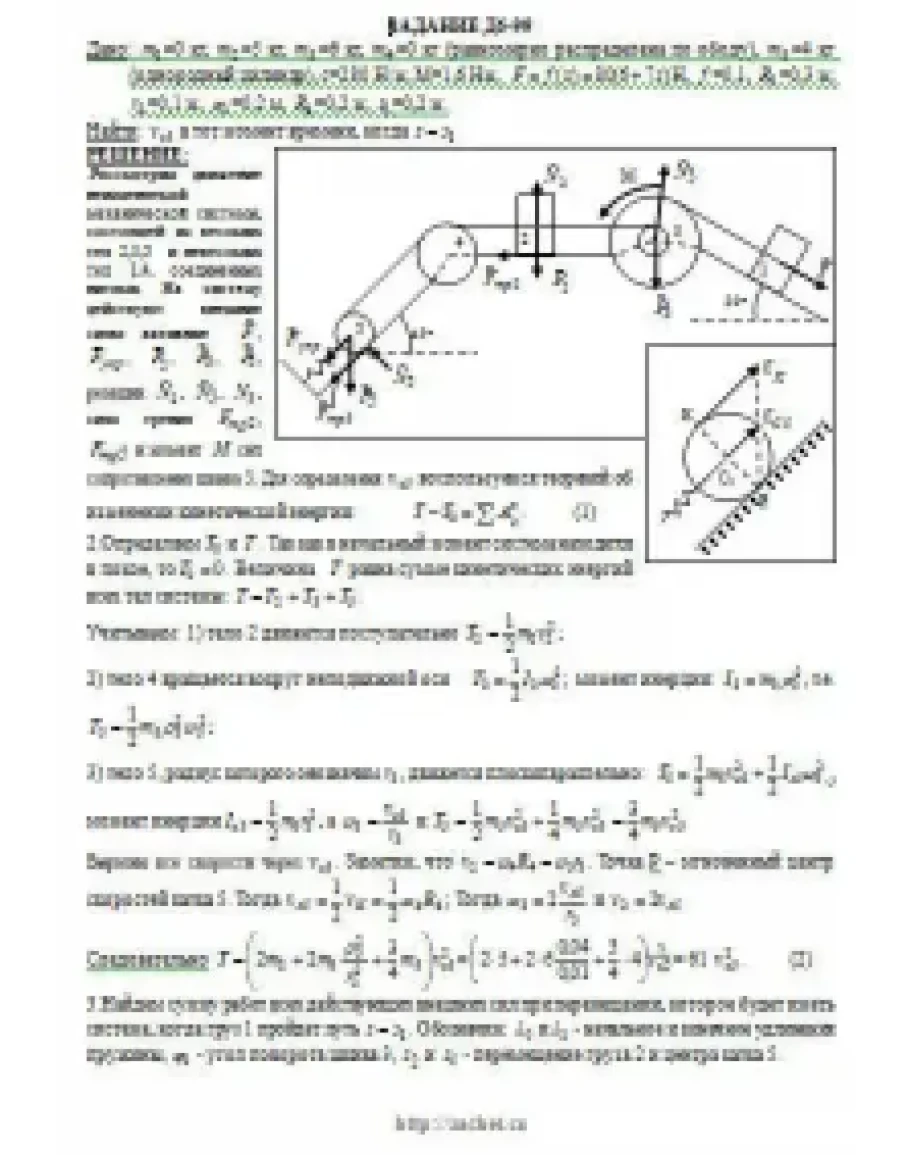 Механическая система состоит из грузов 1 и 2, ступенчатого шкива 3 с радиусами ступеней R3 = 0,3 м, r3 = 0,1 м и радиусом инерции относительно оси вращения ρ3 = 0,2 м, блока 4 радиуса R4 = 0,2 м и катка (или подвижного блока) 5 (рис. Д6.0 — Д6.9, табл. Д6); тело 5 считать сплошным однородным цилиндром, а массу блока 4 — равномерно распределенной по ободу. Коэффициент трения грузов о плоскость f = 0,1. Тела системы соединены друг с другом нитями, перекинутыми через блоки и намотанными на шкив 3 (или на шкив и каток); участки нитей параллельны соответствующим плоскостям. К одному из тел прикреплена пружина с коэффициентом жесткости c. Под действием силы F = f(s), зависящей от перемещения s точки ее приложения, система приходит в движение из состояния покоя; деформация пружины в момент начала движения равна нулю. При движении на шкив 3 действует постоянный момент М сил сопротивления (от трения в подшипниках). Определить значение искомой величины в тот момент времени, когда перемещение s станет равным s1 = 0,2 м. Искомая величина указана в столбце «Найти» таблицы, где обозначено: v1, v2, vC5 — скорости грузов 1, 2 и центра масс тела 5 соответственно, ω3 и ω4 — угловые скорости тел 3 и 4. Все катки, включая и катки, обмотанные нитями (как, например, каток 5 на рис. 2), катятся по плоскостям без скольжения. На всех рисунках не изображать груз 2, если m2 = 0; остальные тела должны изображаться и тогда, когда их масса равна нулю.