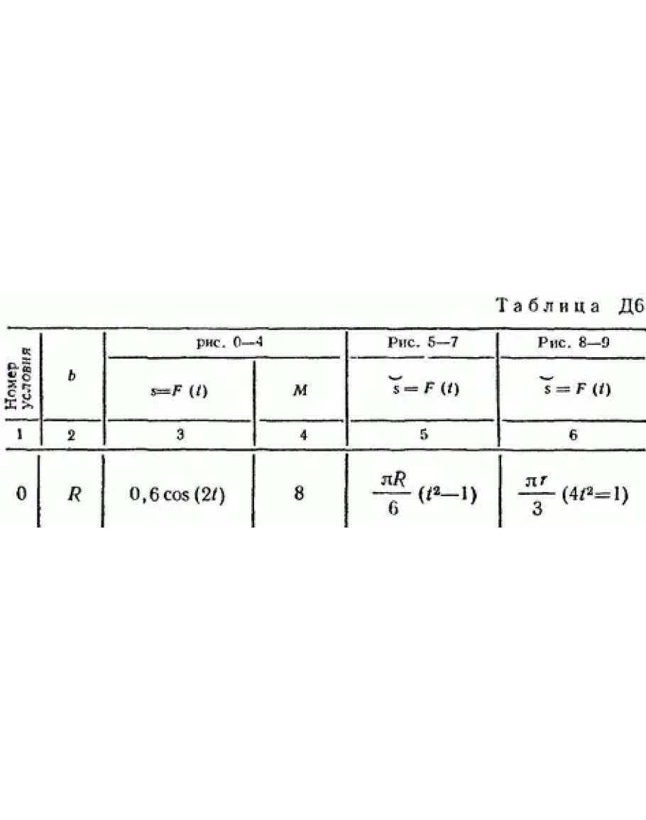 Форма желоба на рис. 0—4 прямолинейная (желоб КЕ), на рис. 5, 6, 7 — окружность радиуса R (обод платформы), на рис. 8, 9 — окружность радиуса r = 0,5 R, На всех рисунках груз D показан в положении, при котором s>0 (когда s<0, груз находится по другую сторону от точки A); на рис. 5—9 расстояние s = AD отсчитывается по дуге окружности. Изображая чертеж решаемой задачи, провести ось z на заданном расстоянии ОС = Ь от центра С.