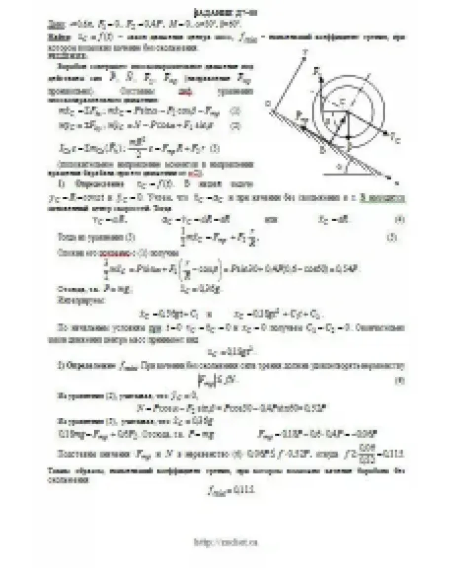 Барабан радиуса R весом P имеет выточку (как у катушки) радиуса r = 0,6R (рис. Д7.0 — Д7.9, табл. Д7). К концам намотанных на барабан нитей приложены постоянные силы F1 и F2, направления которых определяются углом β; кроме сил на барабан действует пара с моментом М; когда в таблице М<0, направление момента противоположно показанному на рисунке. При движении, начинающемся из состояния покоя, барабан катится без скольжения по шероховатой наклонной плоскости с углом наклона α так, как показано на рисунках. Пренебрегая сопротивлением качению, определить закон движения центра масс С барабана, т. е. xC = f(t), и наименьшее значение коэффициента трения f о плоскость, при котором возможно качение без скольжения. Барабан рассматривать как сплошной однородный цилиндр радиуса R.