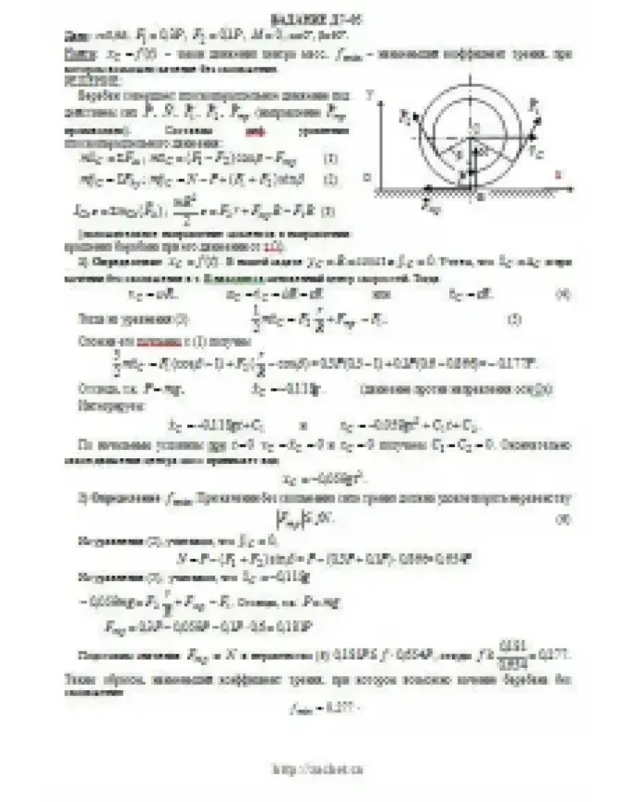 Барабан радиуса R весом P имеет выточку (как у катушки) радиуса r = 0,6R (рис. Д7.0 — Д7.9, табл. Д7). К концам намотанных на барабан нитей приложены постоянные силы F1 и F2, направления которых определяются углом β; кроме сил на барабан действует пара с моментом М; когда в таблице М<0, направление момента противоположно показанному на рисунке. При движении, начинающемся из состояния покоя, барабан катится без скольжения по шероховатой наклонной плоскости с углом наклона α так, как показано на рисунках. Пренебрегая сопротивлением качению, определить закон движения центра масс С барабана, т. е. xC = f(t), и наименьшее значение коэффициента трения f о плоскость, при котором возможно качение без скольжения. Барабан рассматривать как сплошной однородный цилиндр радиуса R.