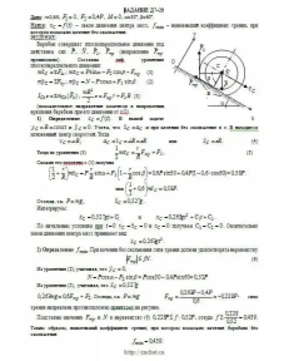 Барабан радиуса R весом P имеет выточку (как у катушки) радиуса r = 0,6R (рис. Д7.0 — Д7.9, табл. Д7). К концам намотанных на барабан нитей приложены постоянные силы F1 и F2, направления которых определяются углом β; кроме сил на барабан действует пара с моментом М; когда в таблице М<0, направление момента противоположно показанному на рисунке. При движении, начинающемся из состояния покоя, барабан катится без скольжения по шероховатой наклонной плоскости с углом наклона α так, как показано на рисунках. Пренебрегая сопротивлением качению, определить закон движения центра масс С барабана, т. е. xC = f(t), и наименьшее значение коэффициента трения f о плоскость, при котором возможно качение без скольжения. Барабан рассматривать как сплошной однородный цилиндр радиуса R.