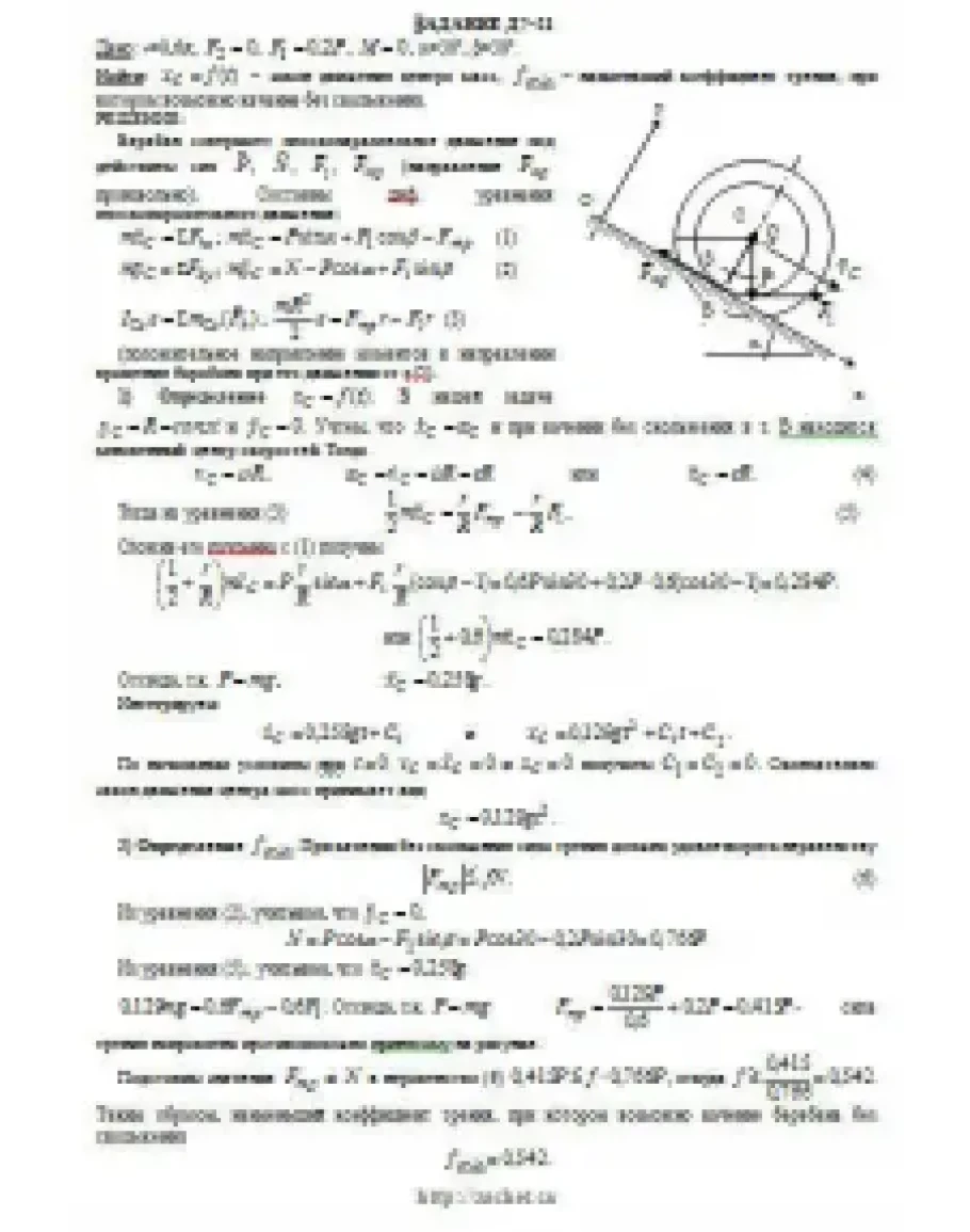 Барабан радиуса R весом P имеет выточку (как у катушки) радиуса r = 0,6R (рис. Д7.0 — Д7.9, табл. Д7). К концам намотанных на барабан нитей приложены постоянные силы F1 и F2, направления которых определяются углом β; кроме сил на барабан действует пара с моментом М; когда в таблице М<0, направление момента противоположно показанному на рисунке. При движении, начинающемся из состояния покоя, барабан катится без скольжения по шероховатой наклонной плоскости с углом наклона α так, как показано на рисунках. Пренебрегая сопротивлением качению, определить закон движения центра масс С барабана, т. е. xC = f(t), и наименьшее значение коэффициента трения f о плоскость, при котором возможно качение без скольжения. Барабан рассматривать как сплошной однородный цилиндр радиуса R.