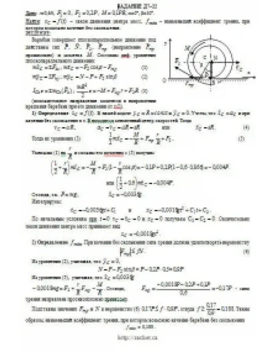 Барабан радиуса R весом P имеет выточку (как у катушки) радиуса r = 0,6R (рис. Д7.0 — Д7.9, табл. Д7). К концам намотанных на барабан нитей приложены постоянные силы F1 и F2, направления которых определяются углом β; кроме сил на барабан действует пара с моментом М; когда в таблице М<0, направление момента противоположно показанному на рисунке. При движении, начинающемся из состояния покоя, барабан катится без скольжения по шероховатой наклонной плоскости с углом наклона α так, как показано на рисунках. Пренебрегая сопротивлением качению, определить закон движения центра масс С барабана, т. е. xC = f(t), и наименьшее значение коэффициента трения f о плоскость, при котором возможно качение без скольжения. Барабан рассматривать как сплошной однородный цилиндр радиуса R.