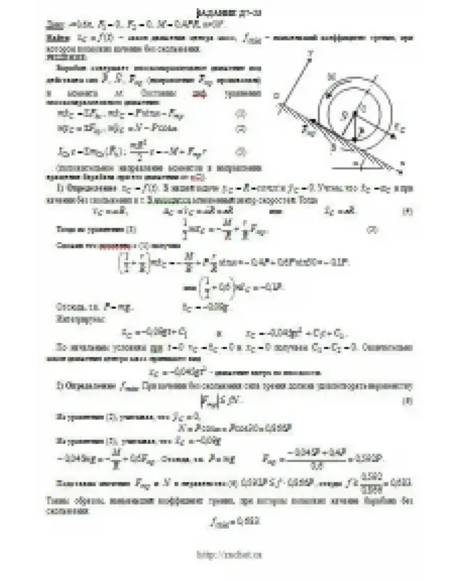 Барабан радиуса R весом P имеет выточку (как у катушки) радиуса r = 0,6R (рис. Д7.0 — Д7.9, табл. Д7). К концам намотанных на барабан нитей приложены постоянные силы F1 и F2, направления которых определяются углом β; кроме сил на барабан действует пара с моментом М; когда в таблице М<0, направление момента противоположно показанному на рисунке. При движении, начинающемся из состояния покоя, барабан катится без скольжения по шероховатой наклонной плоскости с углом наклона α так, как показано на рисунках. Пренебрегая сопротивлением качению, определить закон движения центра масс С барабана, т. е. xC = f(t), и наименьшее значение коэффициента трения f о плоскость, при котором возможно качение без скольжения. Барабан рассматривать как сплошной однородный цилиндр радиуса R.