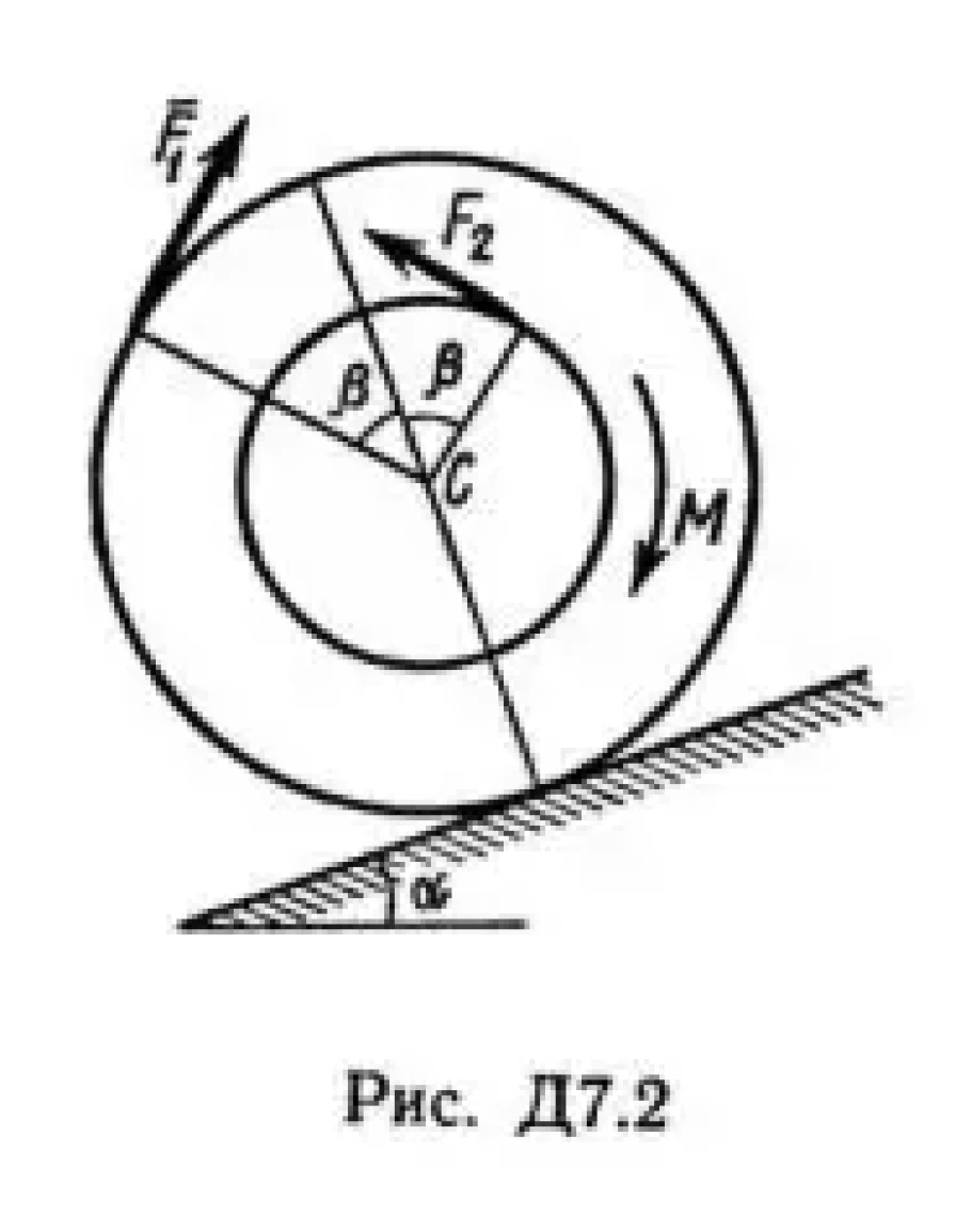 Барабан радиуса R весом P имеет выточку (как у катушки) радиуса r = 0,6R (рис. Д7.0 — Д7.9, табл. Д7). К концам намотанных на барабан нитей приложены постоянные силы F1 и F2, направления которых определяются углом β; кроме сил на барабан действует пара с моментом М; когда в таблице М<0, направление момента противоположно показанному на рисунке. При движении, начинающемся из состояния покоя, барабан катится без скольжения по шероховатой наклонной плоскости с углом наклона α так, как показано на рисунках.