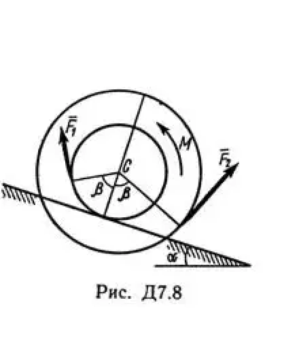 Барабан радиуса R весом P имеет выточку (как у катушки) радиуса r = 0,6R (рис. Д7.0 — Д7.9, табл. Д7). К концам намотанных на барабан нитей приложены постоянные силы F1 и F2, направления которых определяются углом β; кроме сил на барабан действует пара с моментом М; когда в таблице М<0, направление момента противоположно показанному на рисунке. При движении, начинающемся из состояния покоя, барабан катится без скольжения по шероховатой наклонной плоскости с углом наклона α так, как показано на рисунках.