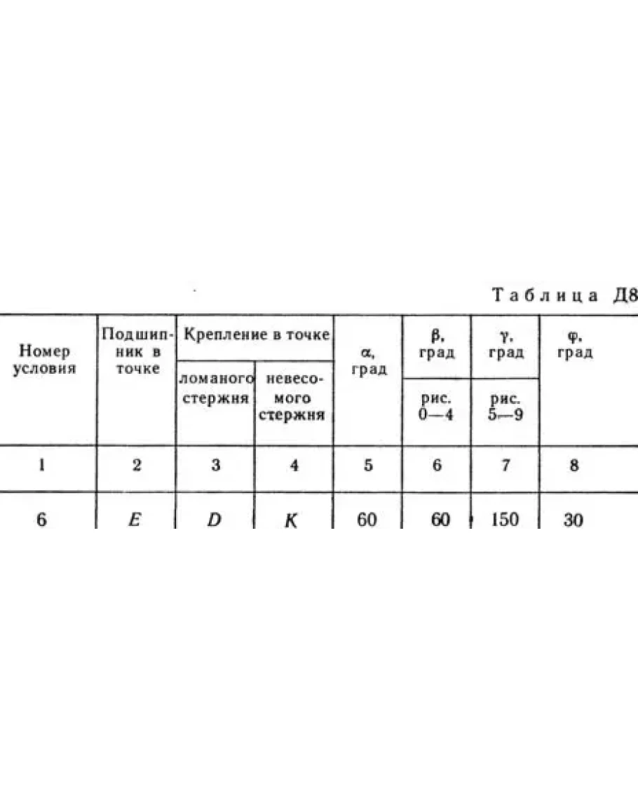 Вертикальный вал АК (рис. Д8.0 — Д8.9), вращающийся с постоянной угловой скоростью ω = 10 с-1, закреплен подпятником в точке A и цилиндрическим подшипником в точке, указанной в табл. Д8 в столбце 2 (АВ = BD = DE = ЕК = a). К валу жестко прикреплены тонкий однородный ломаный стержень массой m = 10 кг, состоящий из частей 1 и 2 (размеры частей стержня показаны на рисунках, где b = 0,1 м, а их массы m1 и m2 пропорциональны длинам), и невесомый стержень длиной l = 4b с точечной массой m3 = 3 кг на конце; оба стержня лежат в одной плоскости. Точки крепления стержней указаны в таблице в столбцах 3 и 4, а углы α, β, γ, φ даны в столбцах 5—8. Пренебрегая весом вала, определить реакции подпятника и подшипника. При подсчетах принять а = 0,6 м.