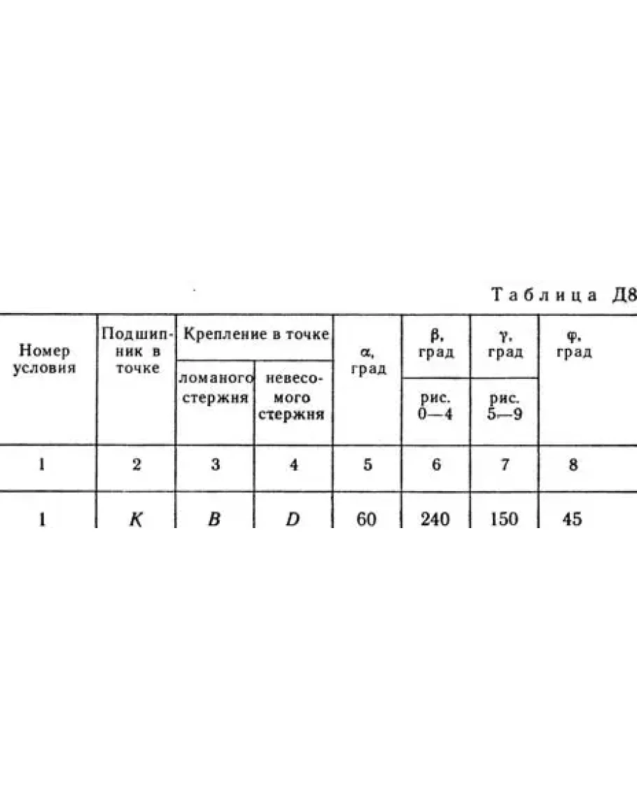 Вертикальный вал АК (рис. Д8.0 — Д8.9), вращающийся с постоянной угловой скоростью ω = 10 с-1, закреплен подпятником в точке A и цилиндрическим подшипником в точке, указанной в табл. Д8 в столбце 2 (АВ = BD = DE = ЕК = a). К валу жестко прикреплены тонкий однородный ломаный стержень массой m = 10 кг, состоящий из частей 1 и 2 (размеры частей стержня показаны на рисунках, где b = 0,1 м, а их массы m1 и m2 пропорциональны длинам), и невесомый стержень длиной l = 4b с точечной массой m3 = 3 кг на конце; оба стержня лежат в одной плоскости. Точки крепления стержней указаны в таблице в столбцах 3 и 4, а углы α, β, γ, φ даны в столбцах 5—8. Пренебрегая весом вала, определить реакции подпятника и подшипника. При подсчетах принять а = 0,6 м.