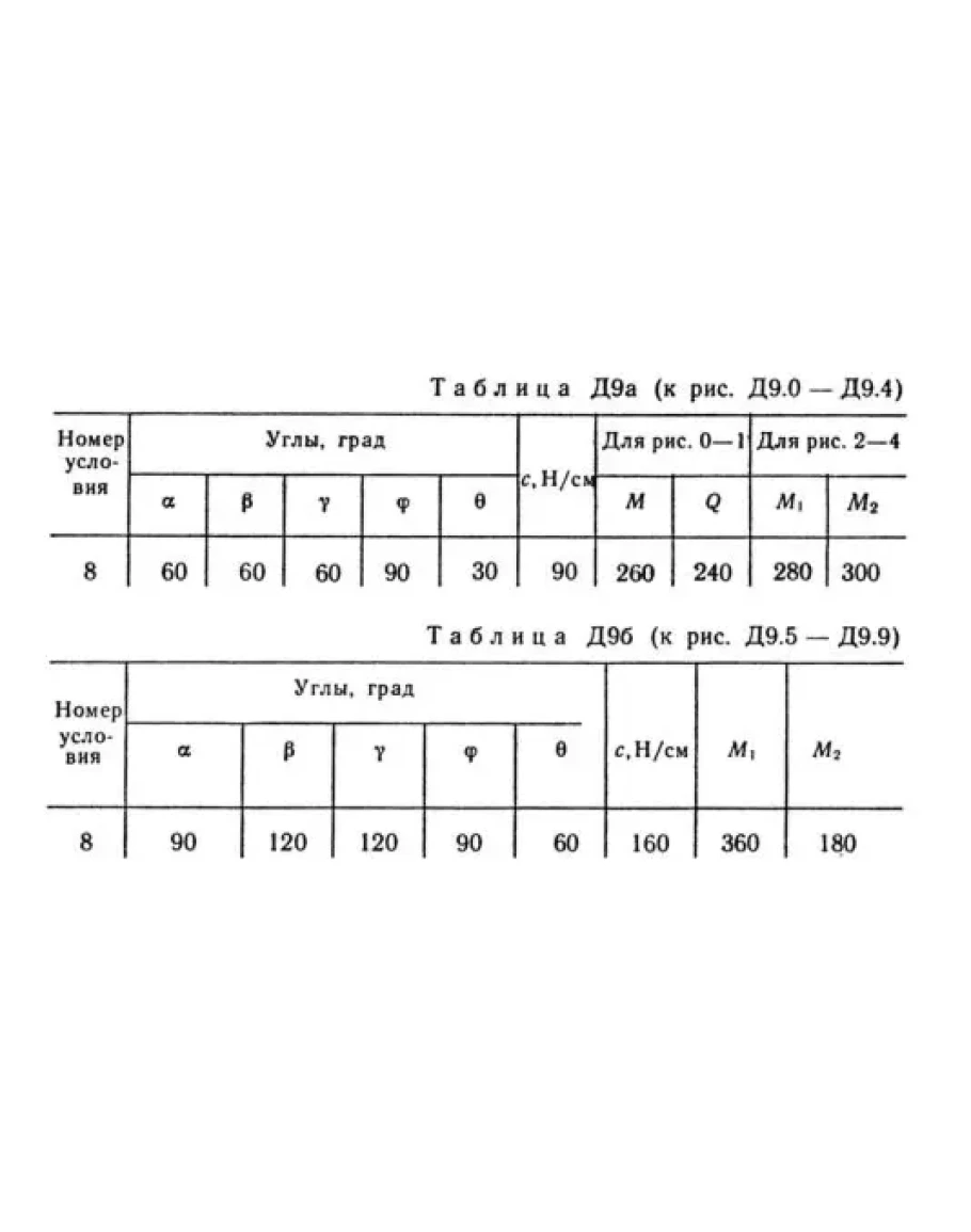 Механизм, расположенный в горизонтальной плоскости, находится под действием приложенных сил в равновесии; положение равновесия определяется углами α, β, γ, φ, θ (рис. Д9.0 — Д9.9, табл. Д9а и Д9б). Длины стержней механизма (кривошипов) равны: l1 = 0,4 м, l4 = 0,6 м (размеры l2 и l3 произвольны); точка Е находится в середине соответствующего стержня. На ползун В механизма действует сила упругости пружины F; численно F = сλ, где с — коэффициент жесткости пружины, λ — ее деформация. Кроме того, на рис. 0 и 1 на ползун D действует сила Q, а на кривошип O1А — пара сил с моментом М; на рис. 2—9 на кривошипы O1А и O2D действуют пары сил с моментами М1 и M2. Определить, чему равна при равновесии деформация λ пружины, и указать, растянута пружина или сжата. Значения всех заданных величин приведены в табл. Д9а для рис. 0—4 и в табл. Д9б для рис. 5—9, где Q выражено в ньютонах, а М, М1, М2 — в ньютонометрах. Построение чертежа начинать со стержня, направление которого определяется углом α; для большей наглядности ползун с направляющими и пружину изобразить так, как в примере Д9 (см. рис. Д9, а также рис. Д9.10, б). Если на чертеже решаемого варианта задачи прикрепленный к ползуну В стержень окажется совмещенным с пружиной (как на рис. Д9.10, а), то пружину следует считать прикрепленной к ползуну с другой стороны (как на рис. Д9.10, б, где одновременно иначе изображены направляющие).