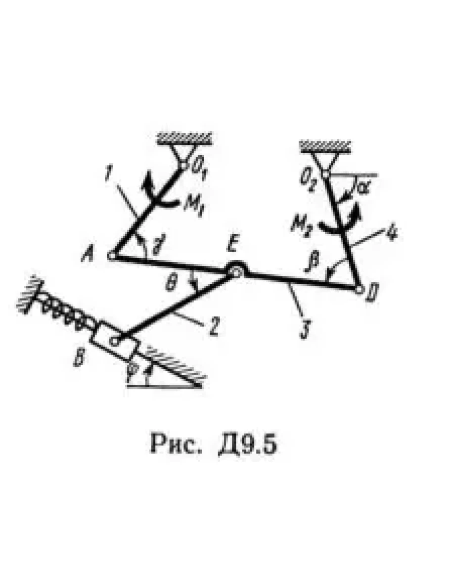 Механизм, расположенный в горизонтальной плоскости, находится под действием приложенных сил в равновесии; положение равновесия определяется углами α, β, γ, φ, θ (рис. Д9.0 — Д9.9, табл. Д9а и Д9б). Длины стержней механизма (кривошипов) равны: l1 = 0,4 м, l4 = 0,6 м (размеры l2 и l3 произвольны); точка Е находится в середине соответствующего стержня. На ползун В механизма действует сила упругости пружины F; численно F = сλ, где с — коэффициент жесткости пружины, λ — ее деформация. Кроме того, на рис. 0 и 1 на ползун D действует сила Q, а на кривошип O1А — пара сил с моментом М; на рис. 2—9 на кривошипы O1А и O2D действуют пары сил с моментами М1 и M2. Определить, чему равна при равновесии деформация λ пружины, и указать, растянута пружина или сжата. Значения всех заданных величин приведены в табл. Д9а для рис. 0—4 и в табл. Д9б для рис. 5—9, где Q выражено в ньютонах, а М, М1, М2 — в ньютонометрах. Построение чертежа начинать со стержня, направление которого определяется углом α; для большей наглядности ползун с направляющими и пружину изобразить так, как в примере Д9 (см. рис. Д9, а также рис. Д9.10, б). Если на чертеже решаемого варианта задачи прикрепленный к ползуну В стержень окажется совмещенным с пружиной (как на рис. Д9.10, а), то пружину следует считать прикрепленной к ползуну с другой стороны (как на рис. Д9.10, б, где одновременно иначе изображены направляющие).