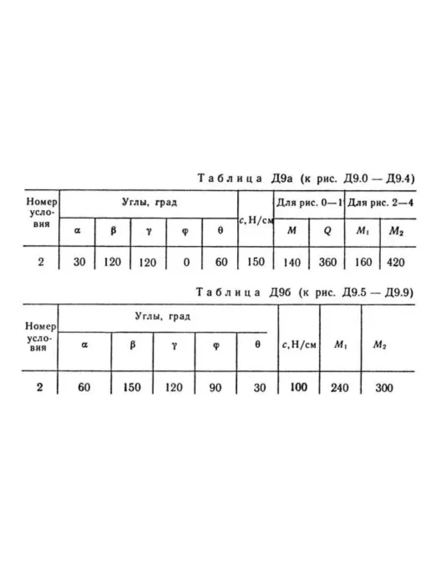 Механизм, расположенный в горизонтальной плоскости, находится под действием приложенных сил в равновесии; положение равновесия определяется углами α, β, γ, φ, θ (рис. Д9.0 — Д9.9, табл. Д9а и Д9б). Длины стержней механизма (кривошипов) равны: l1 = 0,4 м, l4 = 0,6 м (размеры l2 и l3 произвольны); точка Е находится в середине соответствующего стержня. На ползун В механизма действует сила упругости пружины F; численно F = сλ, где с — коэффициент жесткости пружины, λ — ее деформация. Кроме того, на рис. 0 и 1 на ползун D действует сила Q, а на кривошип O1А — пара сил с моментом М; на рис. 2—9 на кривошипы O1А и O2D действуют пары сил с моментами М1 и M2. Определить, чему равна при равновесии деформация λ пружины, и указать, растянута пружина или сжата. Значения всех заданных величин приведены в табл. Д9а для рис. 0—4 и в табл. Д9б для рис. 5—9, где Q выражено в ньютонах, а М, М1, М2 — в ньютонометрах. Построение чертежа начинать со стержня, направление которого определяется углом α; для большей наглядности ползун с направляющими и пружину изобразить так, как в примере Д9 (см. рис. Д9, а также рис. Д9.10, б). Если на чертеже решаемого варианта задачи прикрепленный к ползуну В стержень окажется совмещенным с пружиной (как на рис. Д9.10, а), то пружину следует считать прикрепленной к ползуну с другой стороны (как на рис. Д9.10, б, где одновременно иначе изображены направляющие).