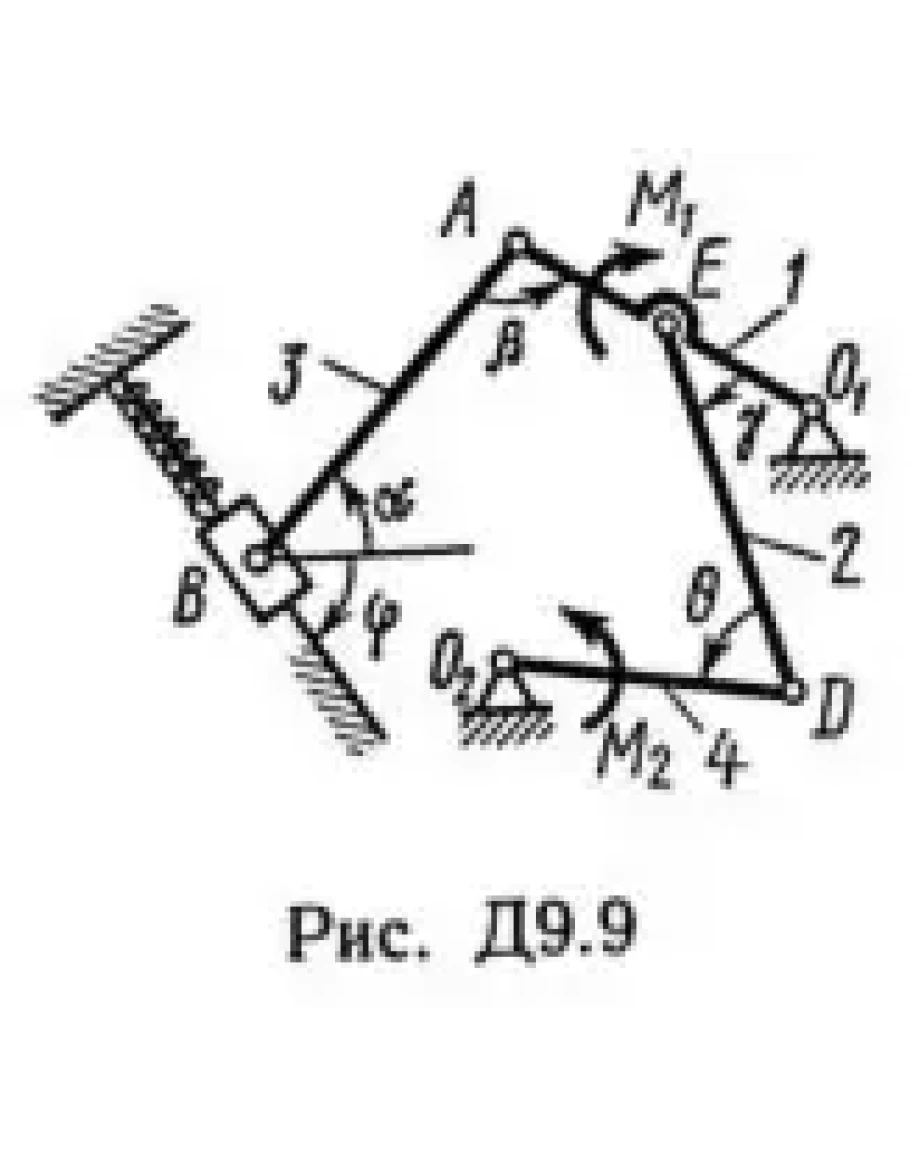 Механизм, расположенный в горизонтальной плоскости, находится под действием приложенных сил в равновесии; положение равновесия определяется углами α, β, γ, φ, θ (рис. Д9.0 — Д9.9, табл. Д9а и Д9б). Длины стержней механизма (кривошипов) равны: l1 = 0,4 м, l4 = 0,6 м (размеры l2 и l3 произвольны); точка Е находится в середине соответствующего стержня. На ползун В механизма действует сила упругости пружины F; численно F = сλ, где с — коэффициент жесткости пружины, λ — ее деформация. Кроме того, на рис. 0 и 1 на ползун D действует сила Q, а на кривошип O1А — пара сил с моментом М; на рис. 2—9 на кривошипы O1А и O2D действуют пары сил с моментами М1 и M2. Определить, чему равна при равновесии деформация λ пружины, и указать, растянута пружина или сжата. Значения всех заданных величин приведены в табл. Д9а для рис. 0—4 и в табл. Д9б для рис. 5—9, где Q выражено в ньютонах, а М, М1, М2 — в ньютонометрах. Построение чертежа начинать со стержня, направление которого определяется углом α; для большей наглядности ползун с направляющими и пружину изобразить так, как в примере Д9 (см. рис. Д9, а также рис. Д9.10, б). Если на чертеже решаемого варианта задачи прикрепленный к ползуну В стержень окажется совмещенным с пружиной (как на рис. Д9.10, а), то пружину следует считать прикрепленной к ползуну с другой стороны (как на рис. Д9.10, б, где одновременно иначе изображены направляющие).