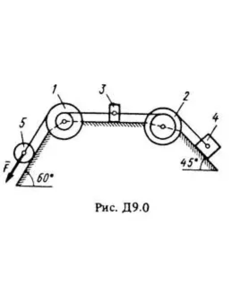 Механическая система состоит из ступенчатых шкивов 1 и2 весом P1 и P2 с радиусами ступеней R1 = R, r1 = 0,4R; R2 = R, r3 = 0,8R (массу каждого шкива считать равномерно распределенной по его внешнему ободу); грузов 3, 4 и сплошного однородного цилиндрического катка 5 весом P3, P4, P5 соответственно (рис. Д9.0-Д9.9 табл. Д9). Тела системы соединены нитями, намотанными на шкивы; участки нитей параллельны соответствующим плоскостям. Грузы Скользят по плоскостям без трения, а катки катяться без скольжения.