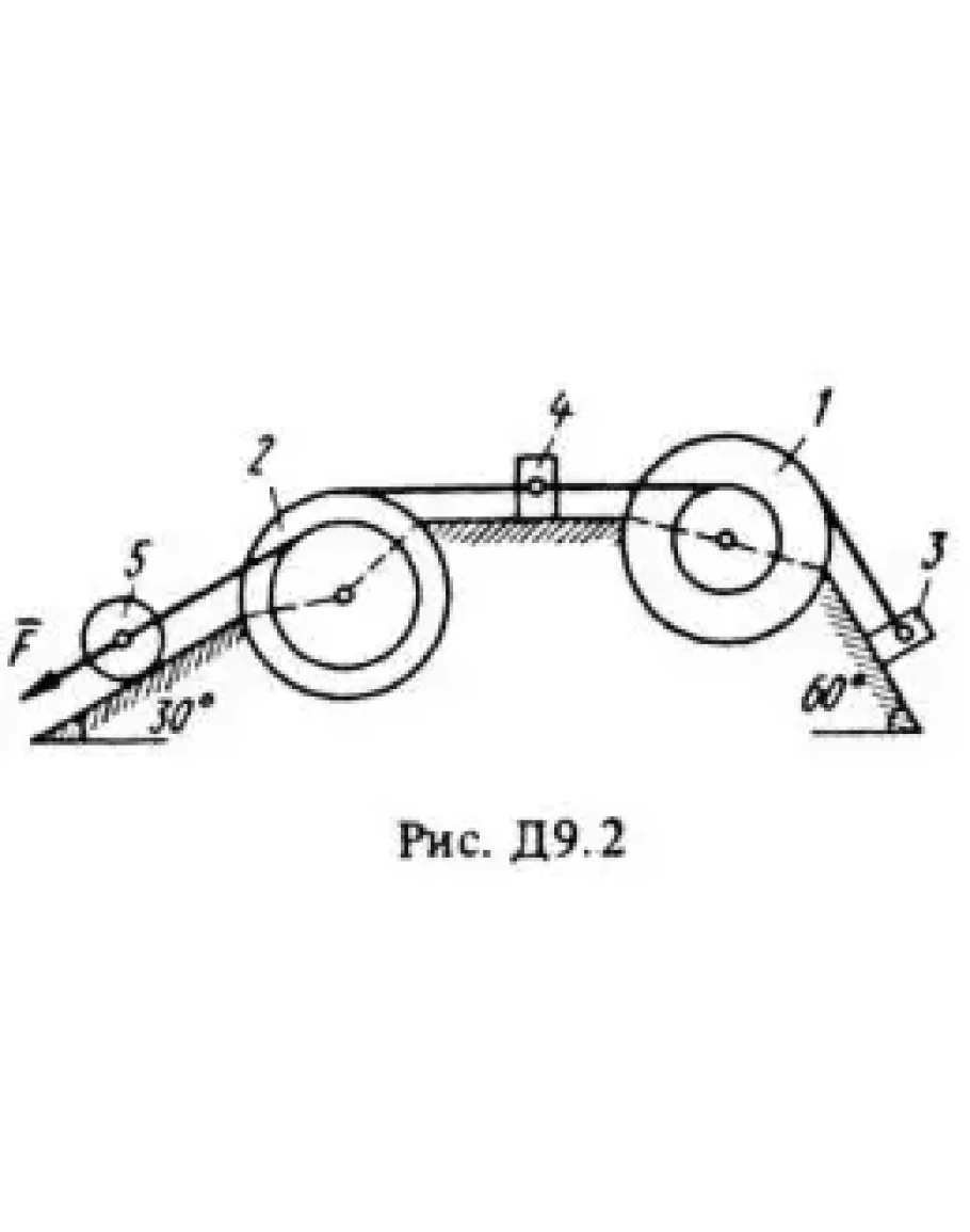 Механическая система состоит из ступенчатых шкивов 1 и2 весом P1 и P2 с радиусами ступеней R1 = R, r1 = 0,4R; R2 = R, r3 = 0,8R (массу каждого шкива считать равномерно распределенной по его внешнему ободу); грузов 3, 4 и сплошного однородного цилиндрического катка 5 весом P3, P4, P5 соответственно (рис. Д9.0-Д9.9 табл. Д9). Тела системы соединены нитями, намотанными на шкивы; участки нитей параллельны соответствующим плоскостям. Грузы Скользят по плоскостям без трения, а катки катяться без скольжения.