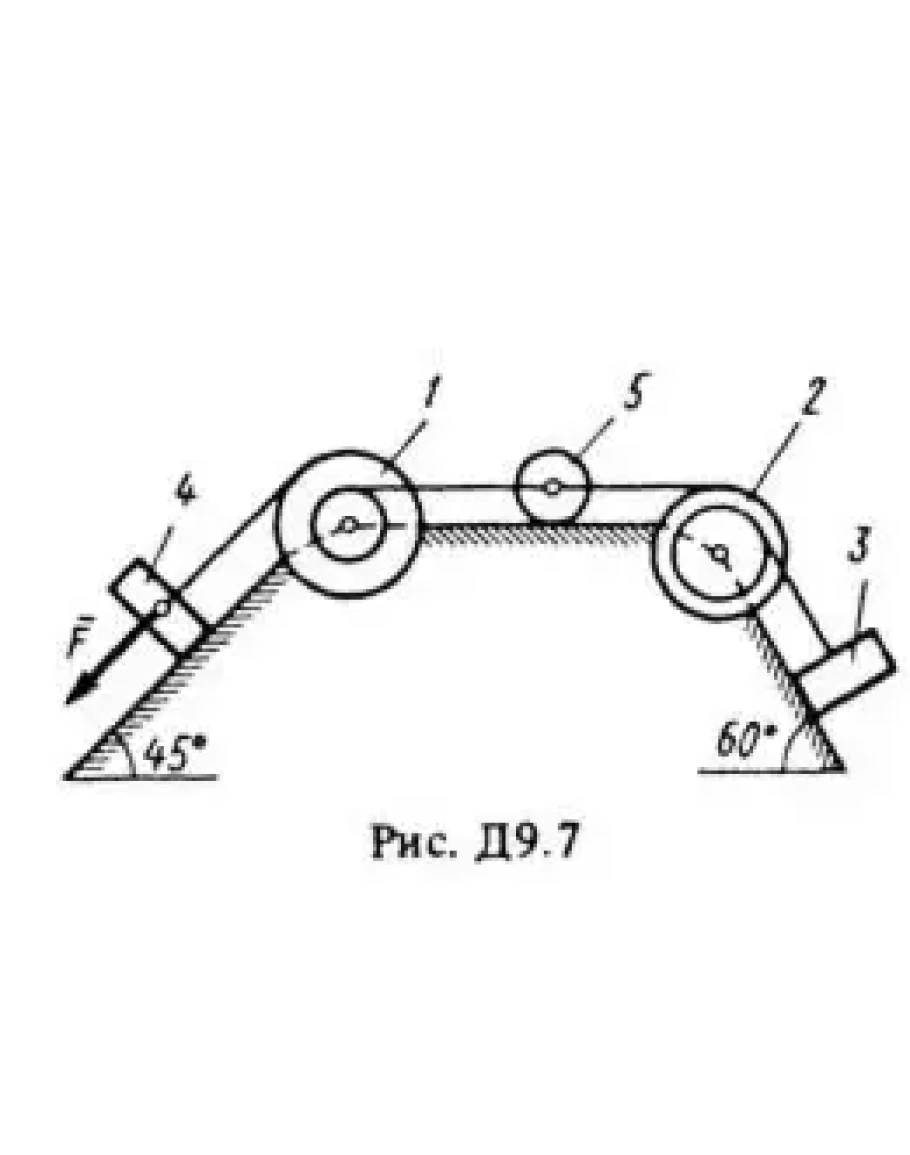 Механическая система состоит из ступенчатых шкивов 1 и2 весом P1 и P2 с радиусами ступеней R1 = R, r1 = 0,4R; R2 = R, r3 = 0,8R (массу каждого шкива считать равномерно распределенной по его внешнему ободу); грузов 3, 4 и сплошного однородного цилиндрического катка 5 весом P3, P4, P5 соответственно (рис. Д9.0-Д9.9 табл. Д9). Тела системы соединены нитями, намотанными на шкивы; участки нитей параллельны соответствующим плоскостям. Грузы Скользят по плоскостям без трения, а катки катяться без скольжения.