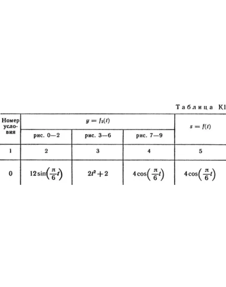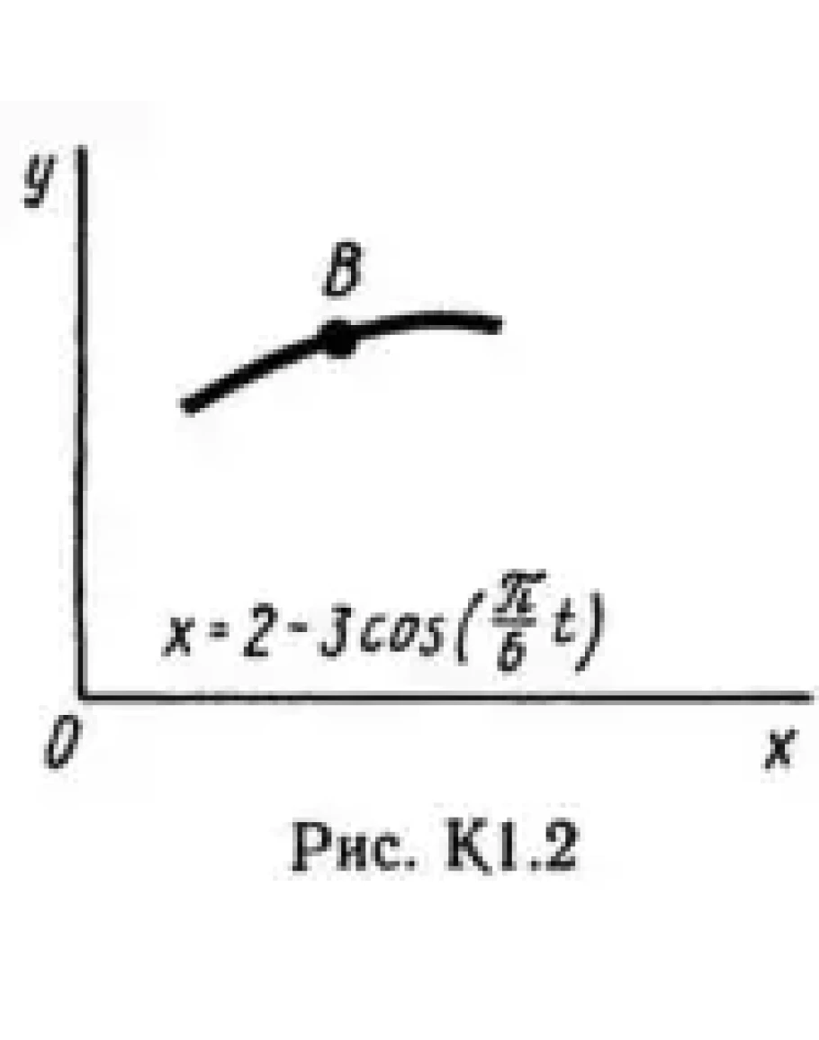 Под номером К1 помещены две задачи К1а и К1б, которые надо решить. Задача К1а. Точка В движется в плоскости xy (рис. К1.0 — К 1.9, табл. К1; траектория точки на рисунках показана условно). Закон движения точки задан уравнениями: x = f1(t), y = f2(t), где x и y выражены в сантиметрах, t — в секундах. Найти уравнение траектории точки; для момента времени t1 = 1 с определить скорость и ускорение точки, а также ее касательное и нормальное ускорения и радиус кривизны в соответствующей точке траектории. Зависимость x = f1(t) указана непосредственно на рисунках, а зависимость y = f2(t) дана в табл. K1 (для рис. 0—2 в столбце 2, для рис. 3—6 в столбце 3, для рис. 7—9 в столбце 4). Как и в задачах С1 — С4, номер рисунка выбирается по предпоследней цифре шифра, а номер условия в табл. К1 — по последней. Задача К1б. Точка движется по дуге окружности радиуса R = 2 м по закону s = f(t), заданному в табл. К1 в столбце 5 (s — в метрах, t — в секундах), где s =AM — расстояние точки от некоторого начала A, измеренное вдоль дуги окружности. Определить скорость и ускорение точки в момент времени t1 = 1 с. Изобразить на рисунке векторы v и a, считая, что точка в этот момент находится в положении M, а положительное направление отсчета s — от А к М.