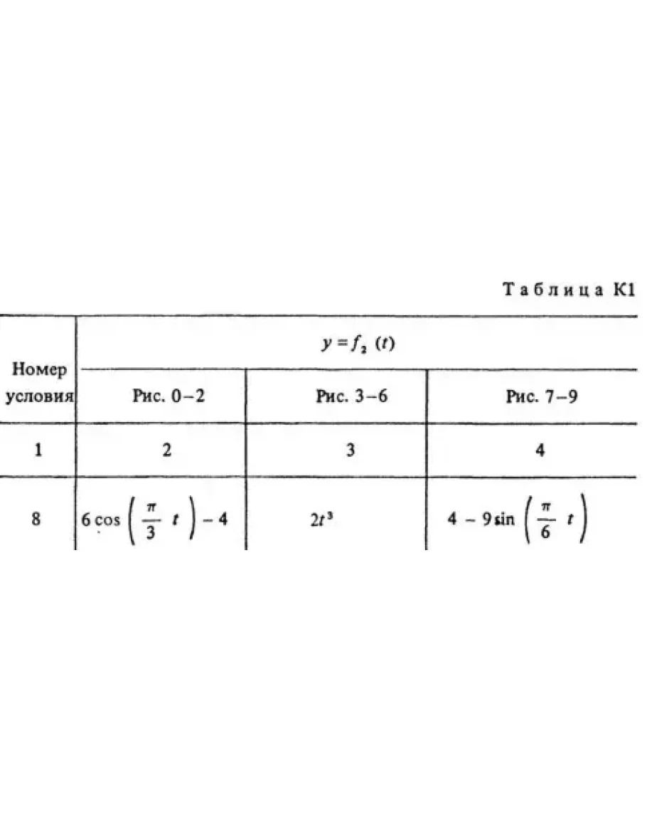 Точка B движется в плоскости xy (рис. К1.0-К1.9, табл. К1; траектория точки на рисунках показана условно). Закон движения точки задан уравнениями: x = f1(t), y = f2(t), где x и y выражены в сантиметрах, t – в секундах. Найти уравнение траектории; для момента времени t1 = 1 с определить скорость и ускорение точки, а также ее касательное ускорение и радиус кривизны в соответствующей точке траектории. Зависимость x = f1(t) указана непосредственно на рисунках, а зависимость y = f2(t) дана в табл. К1 (для рис. 0-2 в столбце 2, для рис. 3-6 в столбце 3, для рис. 7-9 в столбце 4).