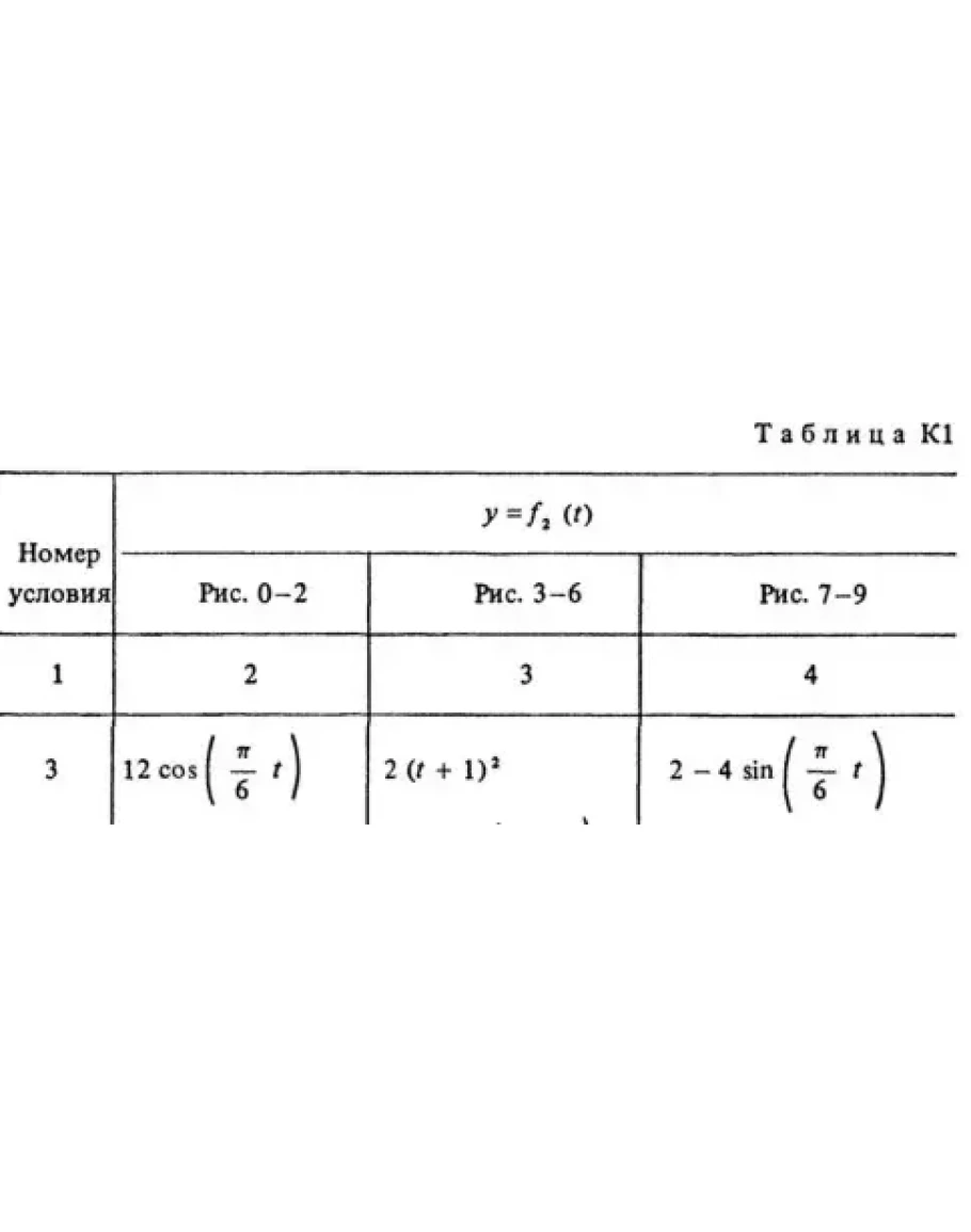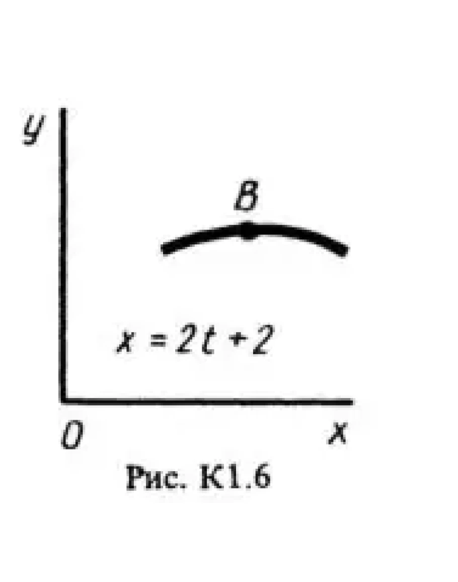 Точка B движется в плоскости xy (рис. К1.0-К1.9, табл. К1; траектория точки на рисунках показана условно). Закон движения точки задан уравнениями: x = f1(t), y = f2(t), где x и y выражены в сантиметрах, t – в секундах. Найти уравнение траектории; для момента времени t1 = 1 с определить скорость и ускорение точки, а также ее касательное ускорение и радиус кривизны в соответствующей точке траектории. Зависимость x = f1(t) указана непосредственно на рисунках, а зависимость y = f2(t) дана в табл. К1 (для рис. 0-2 в столбце 2, для рис. 3-6 в столбце 3, для рис. 7-9 в столбце 4).