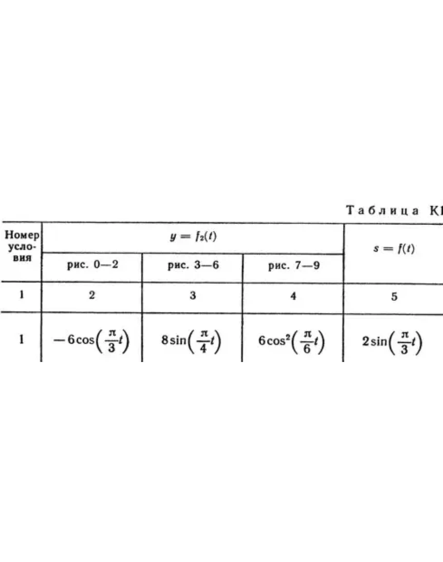 Под номером К1 помещены две задачи К1а и К1б, которые надо решить. Задача К1а. Точка В движется в плоскости xy (рис. К1.0 — К 1.9, табл. К1; траектория точки на рисунках показана условно). Закон движения точки задан уравнениями: x = f1(t), y = f2(t), где x и y выражены в сантиметрах, t — в секундах. Найти уравнение траектории точки; для момента времени t1 = 1 с определить скорость и ускорение точки, а также ее касательное и нормальное ускорения и радиус кривизны в соответствующей точке траектории. Зависимость x = f1(t) указана непосредственно на рисунках, а зависимость y = f2(t) дана в табл. K1 (для рис. 0—2 в столбце 2, для рис. 3—6 в столбце 3, для рис. 7—9 в столбце 4). Как и в задачах С1 — С4, номер рисунка выбирается по предпоследней цифре шифра, а номер условия в табл. К1 — по последней. Задача К1б. Точка движется по дуге окружности радиуса R = 2 м по закону s = f(t), заданному в табл. К1 в столбце 5 (s — в метрах, t — в секундах), где s =AM — расстояние точки от некоторого начала A, измеренное вдоль дуги окружности. Определить скорость и ускорение точки в момент времени t1 = 1 с. Изобразить на рисунке векторы v и a, считая, что точка в этот момент находится в положении M, а положительное направление отсчета s — от А к М.