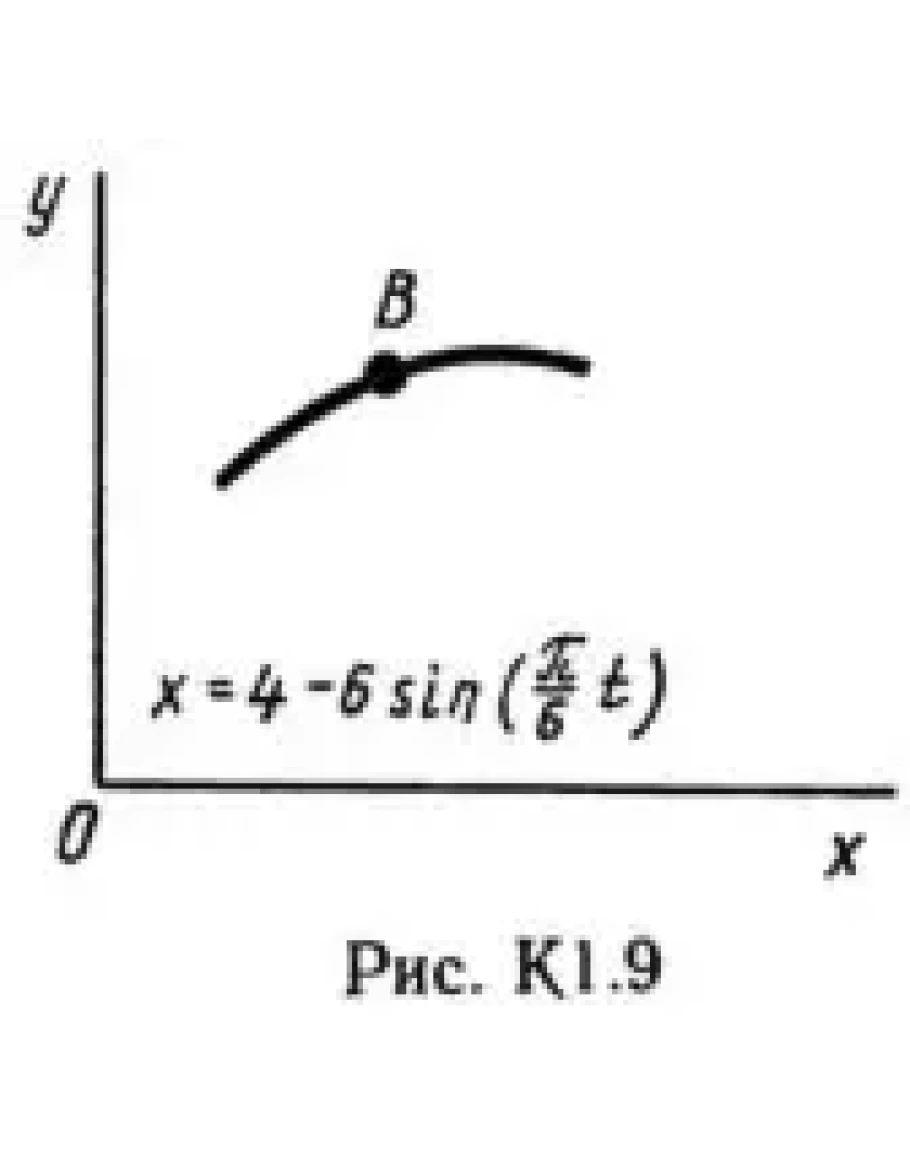 Под номером К1 помещены две задачи К1а и К1б, которые надо решить. Задача К1а. Точка В движется в плоскости xy (рис. К1.0 — К 1.9, табл. К1; траектория точки на рисунках показана условно). Закон движения точки задан уравнениями: x = f1(t), y = f2(t), где x и y выражены в сантиметрах, t — в секундах. Найти уравнение траектории точки; для момента времени t1 = 1 с определить скорость и ускорение точки, а также ее касательное и нормальное ускорения и радиус кривизны в соответствующей точке траектории. Зависимость x = f1(t) указана непосредственно на рисунках, а зависимость y = f2(t) дана в табл. K1 (для рис. 0—2 в столбце 2, для рис. 3—6 в столбце 3, для рис. 7—9 в столбце 4). Как и в задачах С1 — С4, номер рисунка выбирается по предпоследней цифре шифра, а номер условия в табл. К1 — по последней. Задача К1б. Точка движется по дуге окружности радиуса R = 2 м по закону s = f(t), заданному в табл. К1 в столбце 5 (s — в метрах, t — в секундах), где s =AM — расстояние точки от некоторого начала A, измеренное вдоль дуги окружности. Определить скорость и ускорение точки в момент времени t1 = 1 с. Изобразить на рисунке векторы v и a, считая, что точка в этот момент находится в положении M, а положительное направление отсчета s — от А к М.