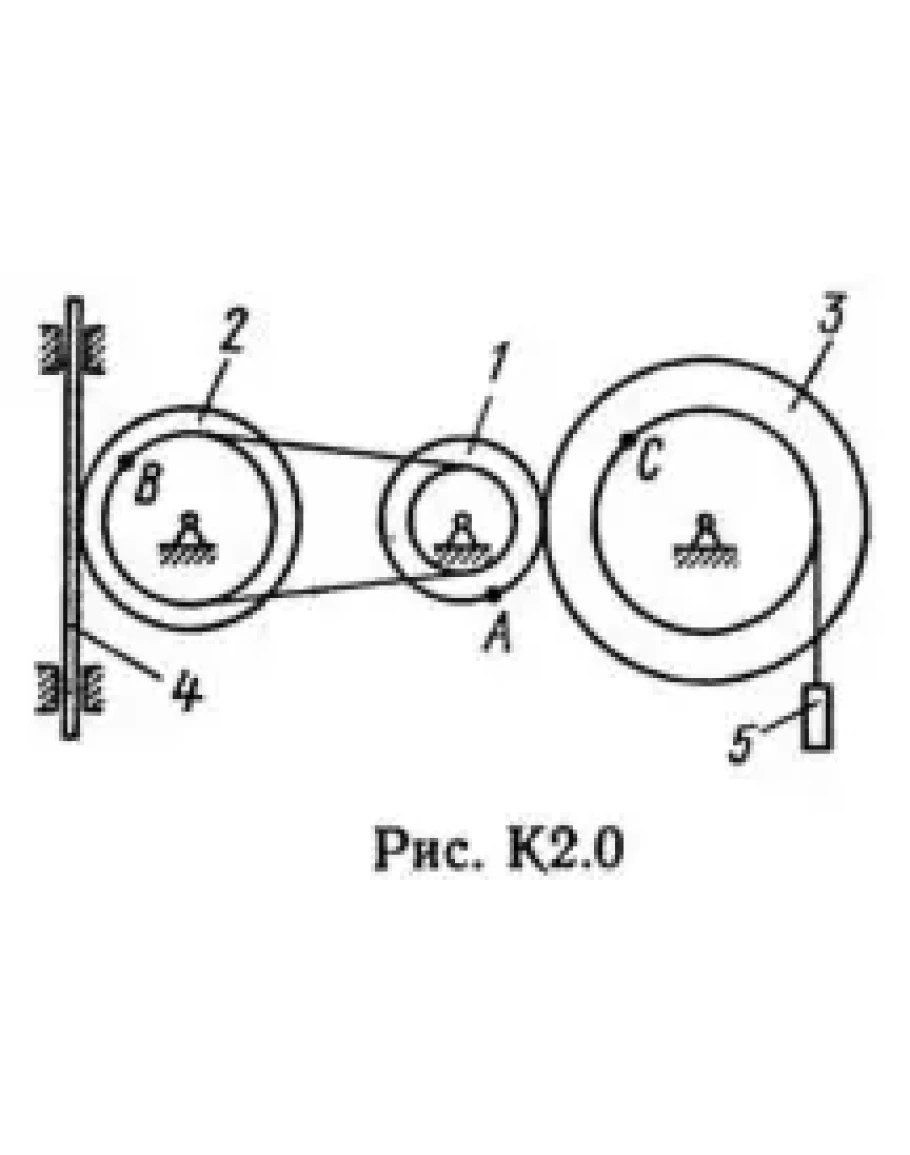 Механизм состоит из ступенчатых колес 1—3, находящихся в зацеплении или связанных ременной передачей, зубчатой рейки 4 и груза 5, привязанного к концу нити, намотанной на одно из колес (рис. К2.0 — К2.9, табл. К2). Радиусы ступеней колес равны соответственно: у колеса 1 – r1 = 2 см, R1 = 4 см, у колеса 2 – r2 = 6 см, R2 = 8 см, у колеса 3 – r3 — 12 см, R3 = 16 см. На ободьях колес расположены точки A, В и С. В столбце «Дано» таблицы указан закон движения или закон изменения скорости ведущего звена механизма, где φ1(t) — закон вращения колеса 1, s2(f) — закон движения рейки 4, ω2(t) — закон изменения угловой скорости колеса 2, v5(t) — закон изменения скорости груза 5 и т. д. (везде φ выражено в радианах, s — в сантиметрах, t — в секундах). Положительное направление для φ и ω против хода часовой стрелки, для s4, s5 и v4, v5 — вниз. Определить в момент времени t1 = 2 с указанные в таблице в столбцах «Найти» скорости (v — линейные, ω — угловые) и ускорения (а — линейные, ε — угловые) соответствующих точек или тел (v5 — скорость груза 5 и т. д.).