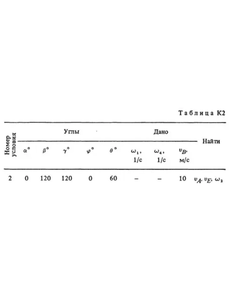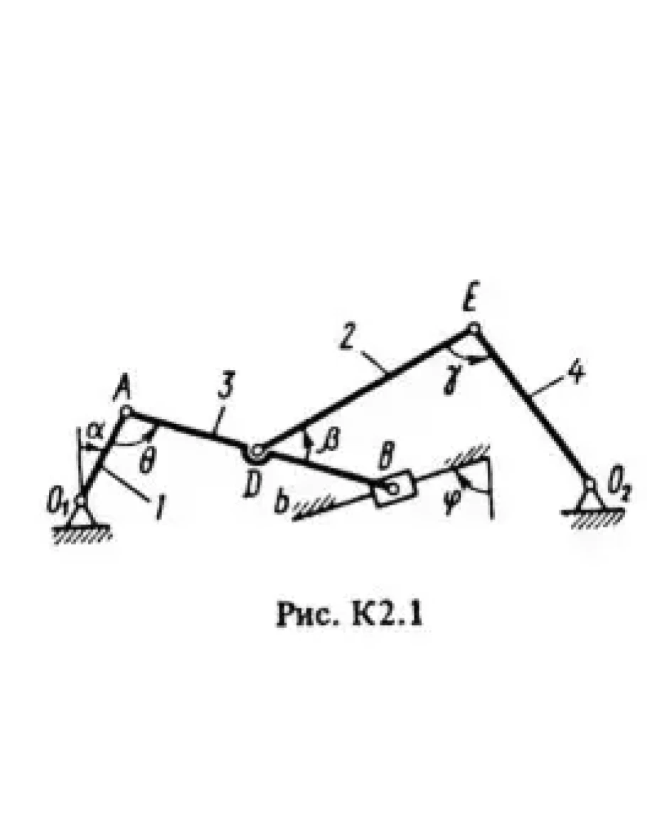 Плоский механизм состоит из стержней 1 – 4 и ползуна B, соединенных друг с другом и с неподвижными опорами O1 и O2 шарнирами (рис. К2.0-К2.9). Длины стержней: l1 = 0,4 м, l2 = 1,2 м, l3 = 1,4 м, l4 = 0,8 м. Положение механизма определяется углами α, β, γ, φ, θ, которые вместе с другими величинами заданы в табл. К2. Точка D на всех рисунках и точка К на рис. К2.7-К2.9 в середине соответствующего стержня. Определить величины, указанные в таблице в столбце «Найти». Найти также ускорение aA точки А стержня 1, если стержень 1 имеет в данный момент времени угловое ускорение ε1 = 10 с-2 Дуговые стрелки на рисунках показывают, как при построении чертежа должны откладываться соответствующие углы, т.е. по ходу или против хода часовой стрелки (например, угол γ на рис. 1 следует отложить от стержня DE против хода часовой стрелки, а на рис. 2 – от стержня AE по ходу часовой стрелки). Построение чертежа начинать со стержня, направление которого определяется углом α; ползун В и его направляющие для большей наглядности изобразить, как в примере К2 (см. рис. К2). Заданную угловую скорость считать направленной против хода часовой стрелки, а заданную скорость vB – от точки В к b.