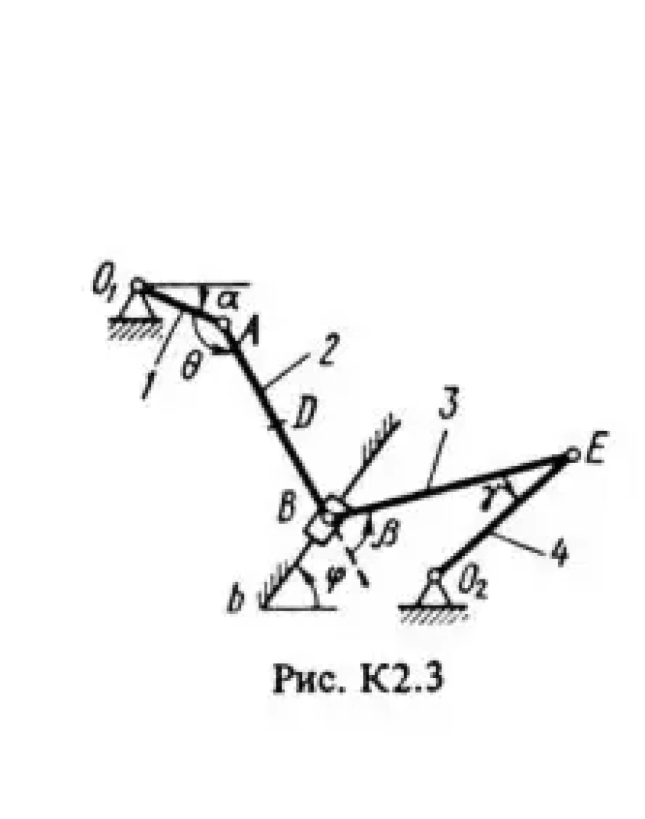 Плоский механизм состоит из стержней 1 – 4 и ползуна B, соединенных друг с другом и с неподвижными опорами O1 и O2 шарнирами (рис. К2.0-К2.9). Длины стержней: l1 = 0,4 м, l2 = 1,2 м, l3 = 1,4 м, l4 = 0,8 м. Положение механизма определяется углами α, β, γ, φ, θ, которые вместе с другими величинами заданы в табл. К2. Точка D на всех рисунках и точка К на рис. К2.7-К2.9 в середине соответствующего стержня. Определить величины, указанные в таблице в столбце «Найти». Найти также ускорение aA точки А стержня 1, если стержень 1 имеет в данный момент времени угловое ускорение ε1 = 10 с-2 Дуговые стрелки на рисунках показывают, как при построении чертежа должны откладываться соответствующие углы, т.е. по ходу или против хода часовой стрелки (например, угол γ на рис. 1 следует отложить от стержня DE против хода часовой стрелки, а на рис. 2 – от стержня AE по ходу часовой стрелки). Построение чертежа начинать со стержня, направление которого определяется углом α; ползун В и его направляющие для большей наглядности изобразить, как в примере К2 (см. рис. К2). Заданную угловую скорость считать направленной против хода часовой стрелки, а заданную скорость vB – от точки В к b.